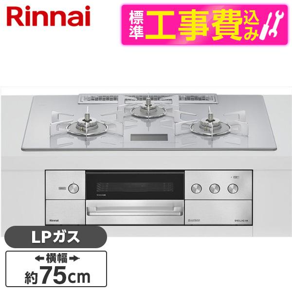 Rinnai RHS72W38M14VNSTW-LP 標準設置工事セット アローズホワイト DELICIA ビルトインガスコンロ(プロパンガス用・両側強火タイプ・3口・75cm)