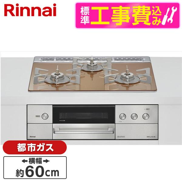 Rinnai RHS31W38M12RCSTW-13A 標準設置工事セット スパークリングカッパー DELICIA ビルトインガスコンロ(都市ガス用・両側強火タイプ・3口・60cm)