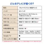 - スペック* インチ: 32V型* 画質: フルHD* タイプ: スマートテレビ* 地デジチューナー数: 2* 入力HDMI数: 2* 対応ネットサービス:YouTube/NETFLIX/Amazon Prime/U-NEXT等* VESA規格:100×100* クロームキャスト機能:有