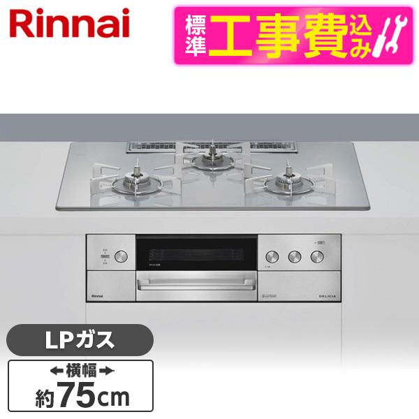Rinnai RHS72W39M14RCSTW-LP 標準設置工事セット アローズホワイト DELICIA (デリシア) ビルトインガスコンロ(プロパンガス用・両側強火タイプ・3口・75cm)