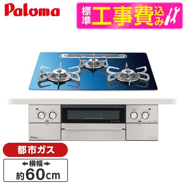 パロマ PD-893WT-U60GA2-13A 標準設置工事セット スカンジナビアブルー FACEIS GRAND ビルトインガスコンロ (都市ガス用・3口・両側強火力・幅60cm)