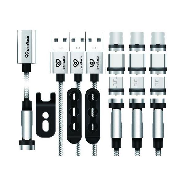 - 【商品説明】●磁石の力でピタッと楽々充電。●使用シーンに合わせた3種の長さのケーブル3本セット。●1本のケーブルでlightning/Type−C/MicroUSBの全てに充電可能。●先端にLEDライト搭載。暗闇でも安心。●水・埃の侵入を防ぎ、抜き差しによる傷も防ぎます。●ケーブルの付け根は180度曲がりスマホを横持ちする際に便利。●マグネット接触部が360度回転。接続方向自由自在。【仕様】●出力(最大):5V/2.4A(12W)●コネクタ:(受電側)USBType−Cオス端子/Lightningオス/MicroUSBオス(給電側)USBAオス3本/USBType−Cメス1本●ケーブル長(約):20cm/50cm/1.0m/2.0m●ケーブル直径(約):3.3mm●USBType−C実装抵抗:56kΩ●対応機種:USBType−Cメス端子・Lightningメス端子・MicroUSBメス端子を搭載した各種スマートフォン、タブレット、電子機器など(5V/2.4Aまで)、USBポート(USBAメスコネクタ)を持つ各社パソコン、USBポート(USBAメスコネクタ)のACアダプタ(5V/2.4Aまで)●セット内容:ケーブル3本(50cm/1m/2m)、Type−C変換ケーブル1本(20cm)、マグネット端子9個(Lightning/Type−C/MicroUSB各3個)、端子ホルダー2個、端子取り外し用フォーク1個、保証書(個装箱に表示)●個装箱寸法(約):幅130x奥25x高210mm●個装箱重量(約):150g●生産国:中国(DesignedinYOKOHAMA)【備考】※メーカーの都合により、パッケージ・仕様等は予告なく変更になる場合がございます。【検索用キーワード】クマザキエイム くまざきえいむ pitaRaku ピタラク ぴたらく 魔法のスマホ充電ケーブル まほうのすまほじゅうでんけーぶる 充電 ケーブル マグネット スマートフォン スマホ 携帯 充電ケーブル マグネット式充電ケーブル USB lightning Type−C MicroUSB Android iPhone PRS−01S PRS−01 PRS01S PRS01 PRS−01 PRS01 充電器 ケーブル ACアダプター シルバー 端子保護 防塵 防水 電話 スマートフォン 携帯電話関連品 ピタ楽 ピタ楽! マグネット脱着式 充電専用 R2207R1度使ったら、普通のケーブルには戻れない。『魔法の』スマホ充電ケーブル