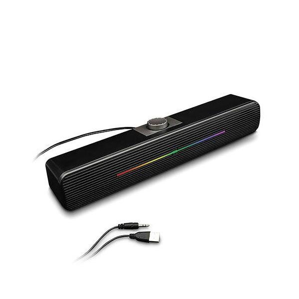 - 【商品説明】PCやTV・音楽プレーヤー等に接続して、最大6W(3W+3W)のサウンドを楽しめるサウンドバーです。電源はお手軽なUSB。大きめのボリュームで簡単に音量調節ができます。●アンプ内蔵の大迫力ステレオサウンド口径40mmのフルレンジスピーカーを左右に配置。コンパクトなボディからは想像できない、臨場感あるステレオサウンドをお楽しみいただけます。●省電力で便利なUSB給電式電源はUSBポートに接続するだけのお手軽仕様。PCやUSB充電器等の様々なUSB電源をご利用いただけます。※USBオーディオ機能は搭載されておりません。サウンド出力には3.5mmプラグの接続が必要です。●3.5mmオーディオプラグスマートフォンやPC / TV / オーディオ機器等の イヤホンジャックやAUX(Line out)端子に接続してご使用いただけます。●カラフルで美しいLEDイルミネーションLEDイルミネーションはUSB電源に接続するとカラフルな光の演出を開始します。TV視聴時に配慮し、イルミネーションは輝度を抑えた上品な光り方となっています。【商品詳細】●電源端子:USB(A)●入力端子:3.5mmオーディオプラグ(ステレオ)●サイズ:約380mm×65mm×70mm●重さ:約530g●スピーカー:φ40mm×2基、6W(3W×2)●材質:ABS●原産国:中国※USB電源は付属しません。【特長】スピーカー、LED、USB、アクティブスピーカー、ゲーミング、バスパワー、イルミネーション、有線、ステレオ、サウンドバー、アクティブ【代引きについて】こちらの商品は、代引きでの出荷は受け付けておりません。【送料について】北海道、沖縄、離島は送料を頂きます。