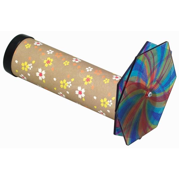 透明板に絵を描いて回すと模様が変化する万華鏡です。