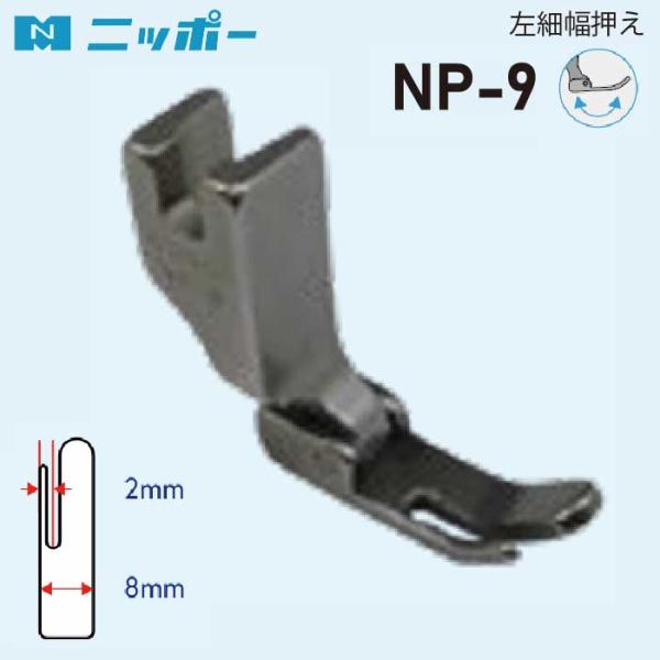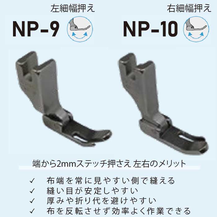 - NIPPO 左細幅押え2mm NP-9 品番:70188 入数:1 用途:ステッチ押さえ 押さえ幅:8mm/ステッチ幅2mm 対応ミシン:工業用・職業用ミシンで使用します (針送りミシン・特殊ミシンには使用できません)。 端から2mmステッチ押さえ 左右のメリット ・布端を常に見やすい側で縫える ・縫い目が安定しやすい ・厚みや折り代を避けやすい ・布を反転させず効率よく作業できる