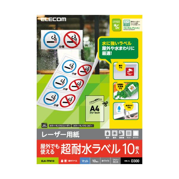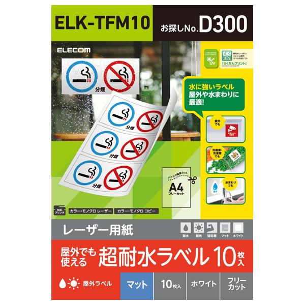 - 【商品解説】●用紙サイズ:A4サイズ(210mm×297mm)●用紙枚数:10枚入り●用紙タイプ:レーザー専用ラベル(マットホワイトフリーカット)●カラー:ホワイト●紙厚:0.160mm●坪量:196g/m2●お探しNo.:D300【スペック】●型式:ELK-TFM10(ELKTFM10)●JANコード:4549550108461サイズ:A4枚数:10枚面付き:1面紙質:マット耐水:耐水対応プリンタ:カラーモノクロレーザー カラーモノクロコピー カラーモノクロコピーこの商品は宅配便でお届けする商品です出荷可能日から最短日時でお届けします。※出荷完了次第メールをお送りします。配送サービス提供エリアを調べることができます「エリア検索」をクリックして、表示された画面にお届け先の郵便番号7桁を入力してください。ご購入可能エリア検索お買い上げ合計3,980円以上で送料無料となります。※3,980円未満の場合は、一律550円(税込)となります。●出荷可能日から最短日時でお届けします。(日時指定は出来ません。) ※お届け時に不在だった場合は、「ご不在連絡票」が投函されます。 「ご不在連絡票」に記載された宅配業者の連絡先へ、再配達のご依頼をお願いいたします。●お届けは玄関先までとなります。●宅配便でお届けする商品をご購入の場合、不用品リサイクル回収はお受けしておりません。●全て揃い次第の出荷となりますので、2種類以上、または2個以上でのご注文の場合、出荷が遅れる場合があります。詳細はこちら■商品のお届けについて商品の到着日については、出荷完了メール内のリンク(宅配業者お荷物お問い合わせサービス)にてご確認ください。詳しいお届け目安を確認する1度の注文で複数の配送先にお届けすることは出来ません。※注文時に「複数の送付先に送る」で2箇所以上への配送先を設定した場合、すべてキャンセルとさせていただきます。