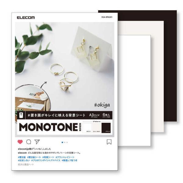 - SEARCH WORD:置き画がキレイに映える背景シート 置き画 置き画シート 背景シート 撮影背景シート フラットレイシート バックペーパー ペーパーシート ペーパー シート 専用シート 紙 専用紙 写真撮影 写真 フォト オリジナル 趣味 撮影 小物 小道具 反射しない 簡易レフ板 レフ板 プロ プロ並み プロ級 芸術 美術 作品 SNS Instagram インスタ インスタ映え Ameba ブログ blog weblog Twitter ツイッタ― ツイート Facebook フェイスブック LIKE いいね フォロー フォロワー商品概要:簡単に映える置き画を撮影できる背景シートです。被写体に合う背景を選ぶことができます。MONOTONEはどんな被写体にも合わせやすく、落ち着いた雰囲気を演出できる背景シートです。シンプルなアクセサリーや影を美しく演出したい時におすすめです。光源の映り込みが少ないマットな質感です。簡易レフ板つきで、印象的な写真を撮るのに役立ちます。プロのワンポイントアドバイスつきで、魅力的な写真を撮るためのテクニックを紹介しています。大き目の対象物におすすめのA3サイズです。商品仕様:■メーカー:エレコム■JANコード:4549550161138■商品名:置き画がキレイに映える背景シート 撮影背景シート MONOTONE A3サイズ 6枚入り 写真撮影■型番:DGA-BPA301■用紙サイズ:A3サイズ(297mm×420mm) ■用紙枚数:6枚入(3パターン×各2枚) ■用紙タイプ:MONOTONE ■カラー:ホワイト/アンティークホワイト/ブラック ■セット内容:背景シート×6枚、簡易レフ板×1枚、取扱説明書(プロのワンポイントアドバイスつき)×1枚※商品概要、仕様、サービス内容及び企業情報などは商品発表時点のものです。※最新の情報に関しましては、メーカーサイトをご覧ください。※発売前予約商品についてはメーカーの商品製造数により納期が遅れる場合やご注文キャンセルをお願いする場合がございます。
