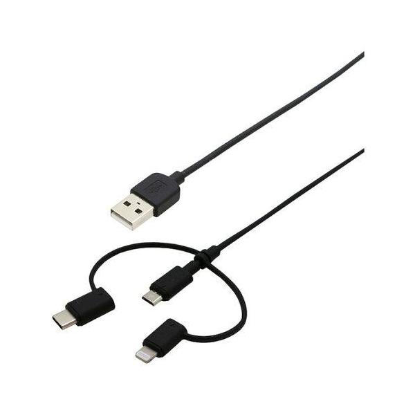 - Apple認証品、Lightning・Type-C・microUSBの3通り対応◎Apple社 MFI認証(Made For iPhone)取得品 ・Type-C端子、Lightning端子、microUSB端子搭載のスマートフォン・タブレット等をパソコンやUSB充電器等で充電・データ通信が可能なケーブル ・Type-C/Lightning変換コネクタキャップをmicroUSBコネクタの上に装着する事で、それぞれの専用ケーブルとして使用可能 ※USB PD(Power Delivery)適合外●カラー:ブラック ●コネクタ形状:USB-Aオス/Type-Cオス+microUSBメス(キャップ)、Lightningオス+microUSBメス(キャップ)、microUSBオス ●対応出力:2.4A ●規格:USB2.0 ●転送速度:480Mbps ●ケーブル長:約1m(コネクタを除く) 保証期間:6ヶ月 生産国:中国