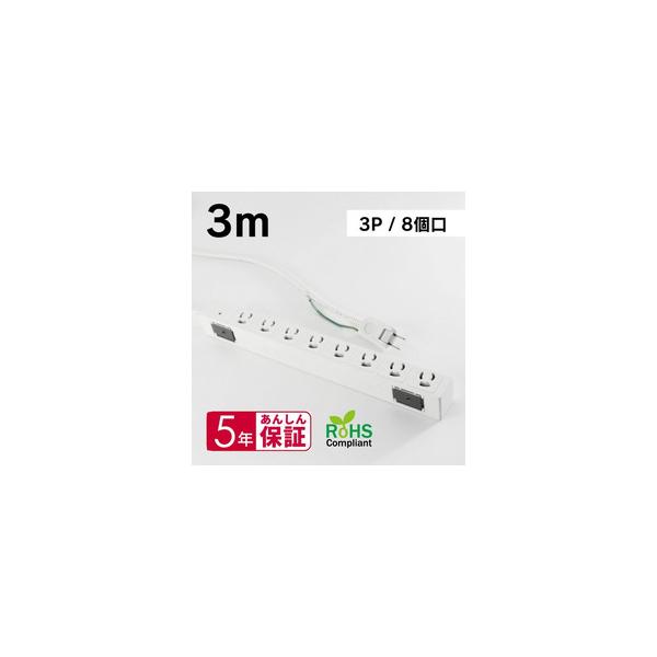 【OAタップ 3P 8口 抜け止めロック 3m】 検索キーワード:エムディーエス ファシリティ関連|電源タップ メーカー型番:MDS-TAP3P803 MDSTAP3P803