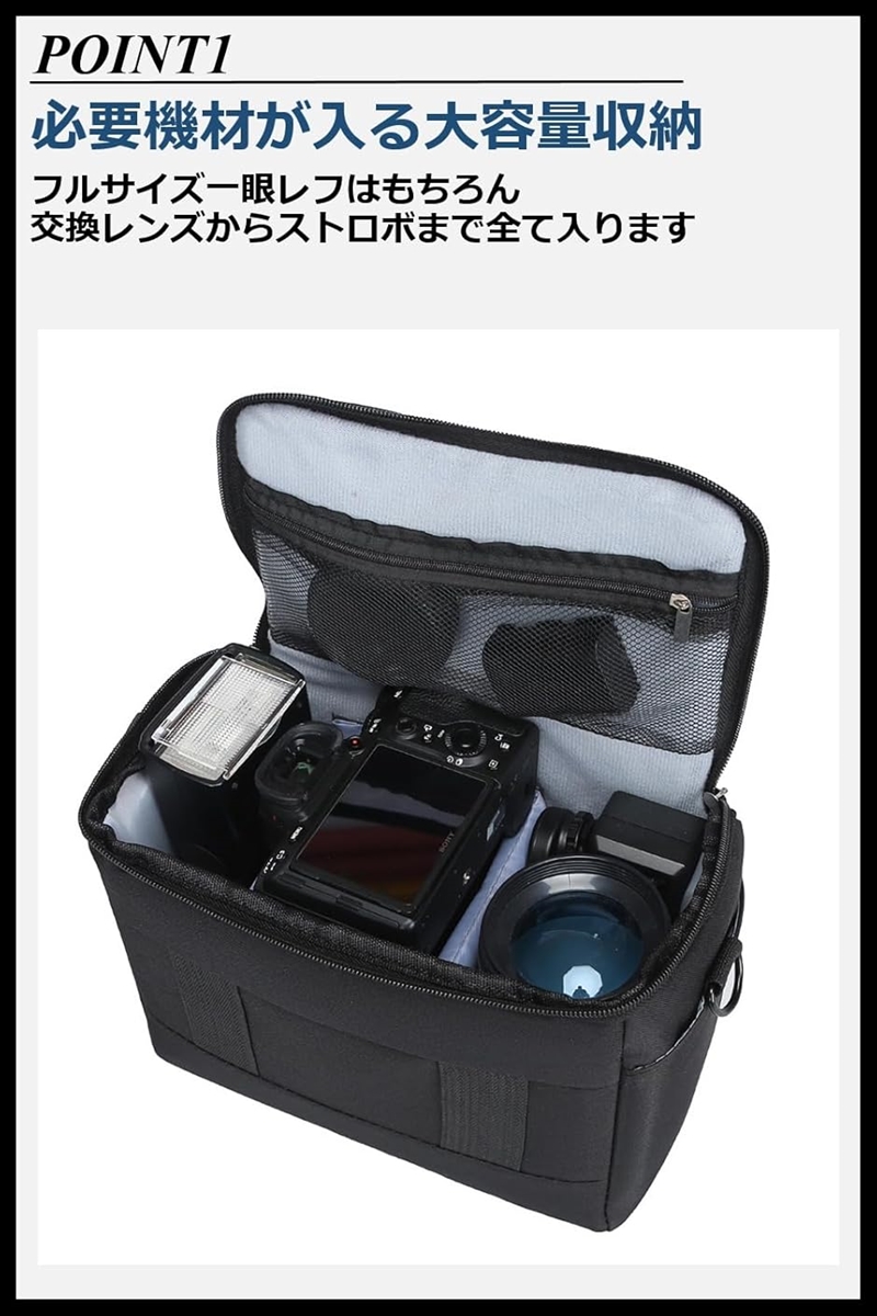 - 大切なカメラ機材を安全かつスタイリッシュに持ち運べる、軽量でおしゃれなショルダータイプのカメラバッグです。肩掛けや斜め掛けスタイルに対応し、アクティブな撮影シーンでも快適な機動性を確保します。一眼レフカメラやミラーレスカメラ本体に加え、交換レンズ数本、ストロボ、バッテリーなどのアクセサリー類も余裕で収納できる大容量設計が魅力。機材に合わせてレイアウトを自由に変更できる、仕切り調節可能なテープ式の中仕切りを装備しています。メイン収納部の他にも、メモリーカードやフィルター、ケーブルなどの小物を整理しやすい便利な前ポケット、サイドポケットを左右両側に配置、さらにバッグ内部には中身が見やすいメッシュタイプのインナーポケットを備えています。収納する機材量や用途に合わせて選べるMサイズとLサイズの2種類をご用意しました。どちらのサイズにも急な天候の変化や悪条件下での撮影時に役立つ専用の防水カバーが付属しており、雨や水しぶきから大切な機材をしっかりと守ります。「サイズ」Mサイズ:(外寸)横幅23x奥行13x高さ17cm (内寸)横幅20x奥行11x高さ14cm Lサイズ:(外寸)横幅26x奥行15x高さ21cm (内寸)横幅22x奥行14x高さ17cm「重さ」Mサイズ:300g Lサイズ:350g「カラー」ブラック、グレー「付属品」防水カバー※ 他ネットショップでも併売しているため、ご注文後に在庫切れとなる場合があります。予めご了承ください。※ 品薄または希少等の理由により、参考価格よりも高い価格で販売されている場合があります。ご注文の際には必ず販売価格をご確認ください。※ 沖縄県、離島または一部地域の場合、別途送料の負担をお願いする場合があります。予めご了承ください。※ お使いのモニタにより写真の色が実際の商品の色と異なる場合や、イメージに差異が生じることがあります。予めご了承ください。※ 商品の詳細(カラー・数量・サイズ 等)については、ページ内の商品説明をご確認のうえ、ご注文ください。※ モバイル版・スマホ版ページでは、お使いの端末によっては一部の情報が表示されないことがあります。すべての記載情報をご確認するには、PC版ページをご覧ください。