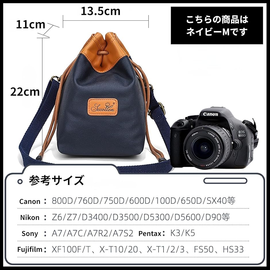 カメラバッグ 巾着 ショルダー カメラポーチ カメラケース 防水 一眼レフ ミラーレス 仕切り付き (ネイビー, M)