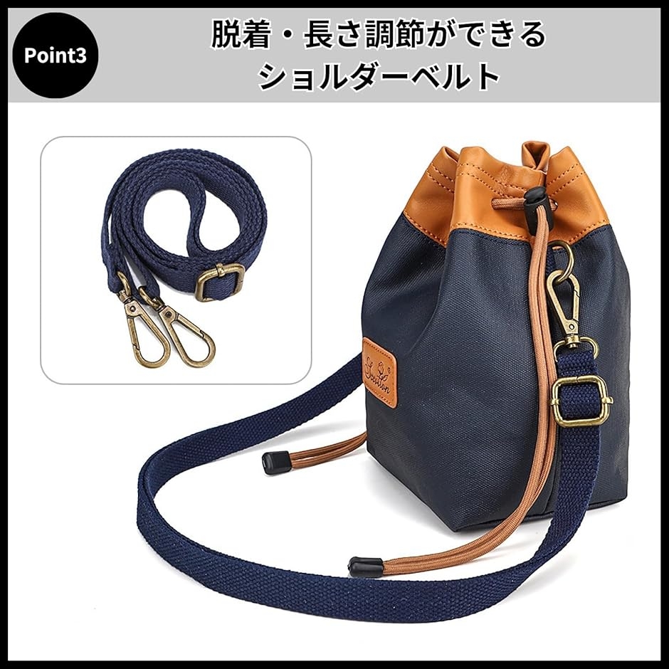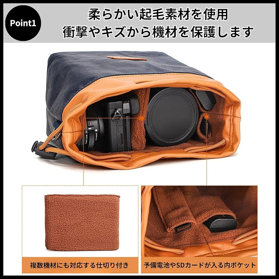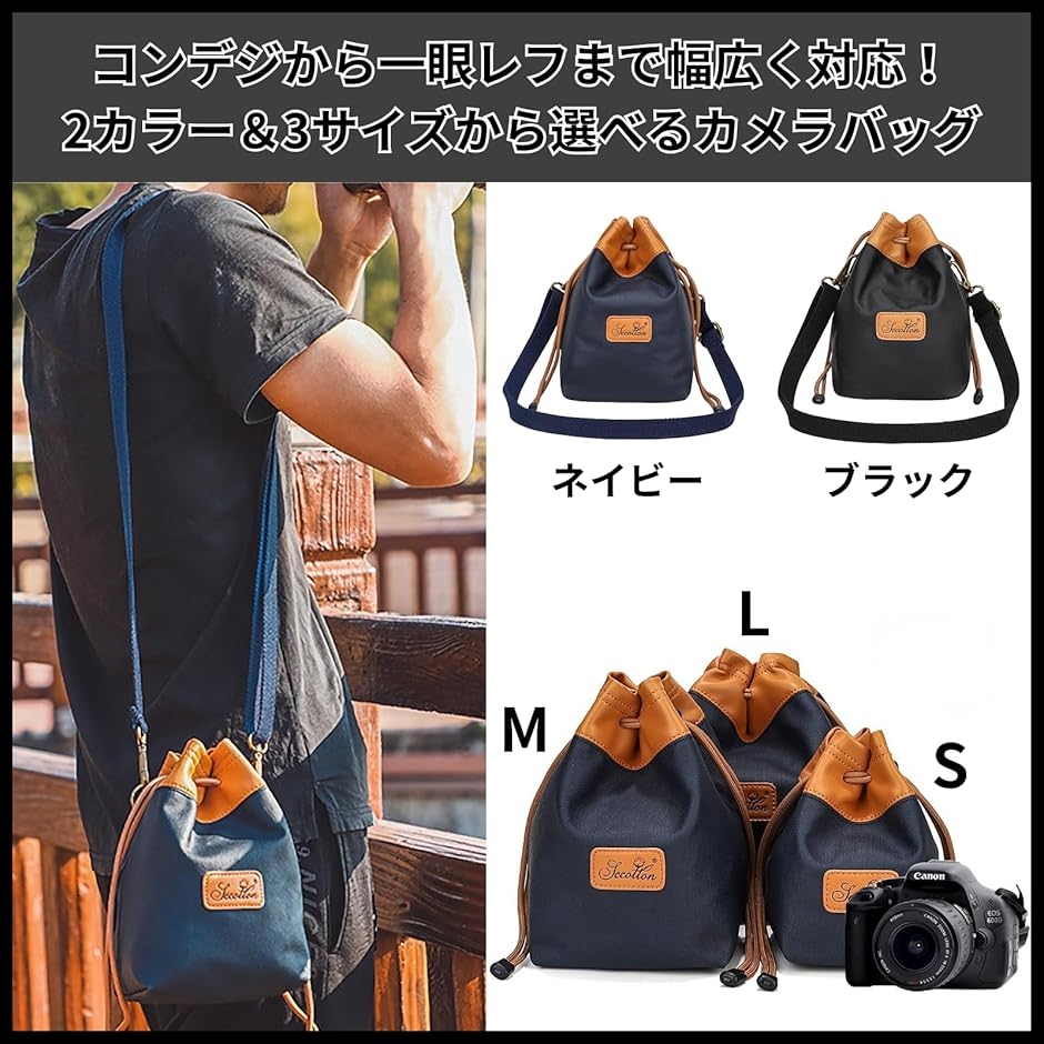 カメラバッグ 巾着 ショルダー カメラポーチ カメラケース 防水 一眼レフ ミラーレス 仕切り付き (ネイビー, L)