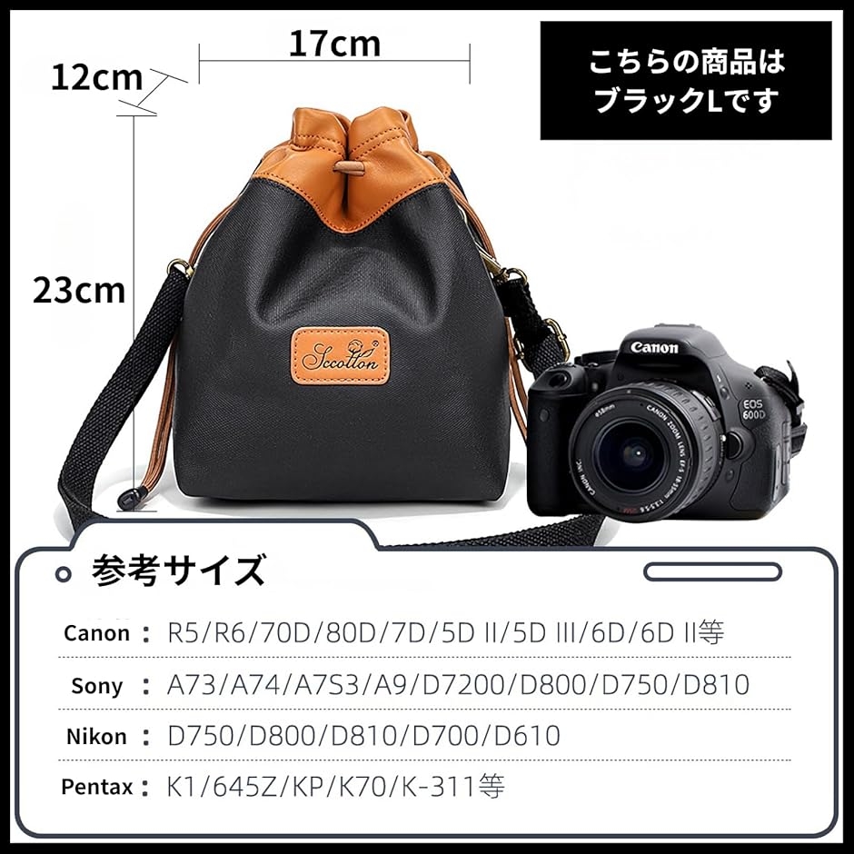 カメラバッグ 巾着 ショルダー カメラポーチ カメラケース 防水 一眼レフ ミラーレス 仕切り付き (ブラック, L)
