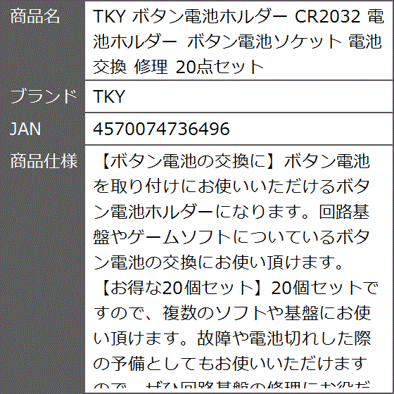 - 「ボタン電池の交換に」ボタン電池を取り付けにお使いいただけるボタン電池ホルダーになります。回路基盤やゲームソフトについているボタン電池の交換にお使い頂けます。「お得な20個セット」20個セットですので、複数のソフトや基盤にお使い頂けます。故障や電池切れした際の予備としてもお使いいただけますので、ぜひ回路基盤の修理にお役だてください。「様々な用途に」端子が折れにくいため工具で曲げやすく、半田つけもしやすくなっております。ファミコンやスーファミ、64などのソフトの電池交換にお役立てください。「商品詳細」本体20個、サイズ:縦24mm,横13mm,厚さ5.3mm,対応電池:CR2032TKYオリジナルパッケージでご提供しております。仕入れ状況により一部仕様変更がある場合がございます。商標登録第6113063号※ 他ネットショップでも併売しているため、ご注文後に在庫切れとなる場合があります。予めご了承ください。※ 品薄または希少等の理由により、参考価格よりも高い価格で販売されている場合があります。ご注文の際には必ず販売価格をご確認ください。※ 沖縄県、離島または一部地域の場合、別途送料の負担をお願いする場合があります。予めご了承ください。※ お使いのモニタにより写真の色が実際の商品の色と異なる場合や、イメージに差異が生じることがあります。予めご了承ください。※ 商品の詳細(カラー・数量・サイズ 等)については、ページ内の商品説明をご確認のうえ、ご注文ください。※ モバイル版・スマホ版ページでは、お使いの端末によっては一部の情報が表示されないことがあります。すべての記載情報をご確認するには、PC版ページをご覧ください。