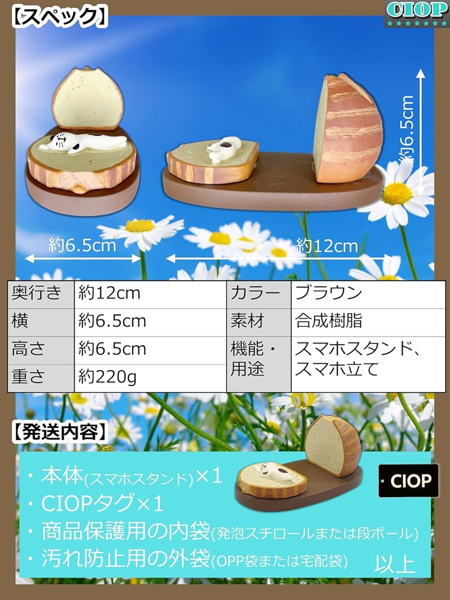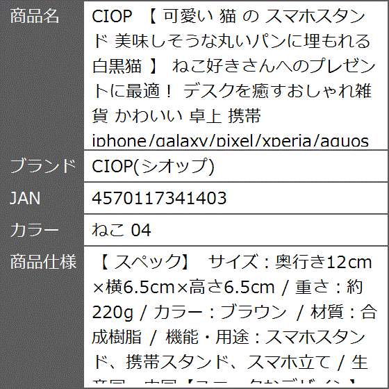 - バリエーションコード : 2b9hy91f14商品コード2bjpkj6lr2商品名可愛い 猫 の スマホスタンド 美味しそうな丸いパンに埋もれる 白黒猫 ねこ好きさんへのプレゼントに最適。 デスクを癒すおしゃれ雑貨 かわいい 卓上 携帯 iphone/galaxy/pixel/xperia/aquos対応ブランドCIOP(シオップ)カラーねこ 04「 スペック」 サイズ:奥行き12cmx横6.5cmx高さ6.5cm / 重さ:約220g / カラー:ブラウン / 材質:合成樹脂 / 機能・用途:スマホスタンド、携帯スタンド、スマホ立て / 生産国:中国「ユニークなデザイン」:優しくコミカルで 丸いパン に埋もれる かわいい 白黒猫 があなたのスマホをやさしく支え見守ってくれます。「️高い安定性」:安定しているのでiPhoneや各スマートフォンを安心してお使いいただけます。また縦置きでもお使いいただけます。ただし、iPadなどの大画面サイズはお使いいただけない場合もございます。「高品質な樹脂」:高品質な合成樹脂を採用することにより、白黒猫が丸いパンの中に埋もれる 可愛い 姿 を細部までこだわることができ、手作業でカラーリングすることでバランスよく仕上げています。「おしゃれに演出」:子供部屋やオフィスをはじめ、どこに置いても気分はわくわく楽しくなるオーナメントですよ。キッチン、ベッドサイドテーブル、ダイニングテーブル、デスク、玄関、お風呂、洗面台、トイレなど。「プレゼントに最適(」誕生日、出産記念・子どもの誕生日、就職・転職・退職祝い、引越し祝い・新築祝い、お正月、バレンタインデー、ひな祭り、ホワイトデー、母の日、父の日、七夕、敬老の日、クリスマス、猫好きさんへのプレゼントに最適です。「様々なスマホサイズに対応」: Apple iPhone ( iPhone3 / iPhone4 / iPhone5 / iPhone6 / iPhone7 / iPhone8 / iPhone9 / iPhoneX / iPhone11 / iPhone12 / iPhone13 / iPhone14 / iPhone15 / iPhone16 / iPhone17 / iPhoneSE 第1~第3世代 ), Samsung ( GalaxyS / GalaxyZ / GalaxyA ) , Google ( Pixel8 / Pixel9 ) , Sony ( Xperia1VII / Xperia1VI ) , SHARP (AQUOS R9) など。あらゆる機種でお使いいただけます。「取り扱い」:本製品が届きましたら箱から取り出し、異物はないかご確認いただき、スマホをセットしお使いください。メモスタンドや写真立てなど、使い方もご想像しながら自由に楽しんでいただけます。またもし若干のにおいが気になりましたら、ご使用前に水洗いまたは1~2日水に浸した後、天日干ししてください。不快になるようなにおいはほとんど無くなります。「新品・海外輸入品」:すべて「新品」です。海外輸入品のため、傷、色むら、しわが若干あったり、カラーやサイズなどが若干異なったりする場合がございます。綺麗な状態で保管しておりますが、神経質な方はご購入をお控えください。また画像は実際の商品に近い色を再現しておりますが、お客様のご覧になられているモニターによっては色味が異なる場合がございます。ご了承ください。※ 他ネットショップでも併売しているため、ご注文後に在庫切れとなる場合があります。予めご了承ください。※ 品薄または希少等の理由により、参考価格よりも高い価格で販売されている場合があります。ご注文の際には必ず販売価格をご確認ください。※ 沖縄県、離島または一部地域の場合、別途送料の負担をお願いする場合があります。予めご了承ください。※ お使いのモニタにより写真の色が実際の商品の色と異なる場合や、イメージに差異が生じることがあります。予めご了承ください。※ 商品の詳細(カラー・数量・サイズ 等)については、ページ内の商品説明をご確認のうえ、ご注文ください。※ モバイル版・スマホ版ページでは、お使いの端末によっては一部の情報が表示されないことがあります。すべての記載情報をご確認するには、PC版ページをご覧ください。
