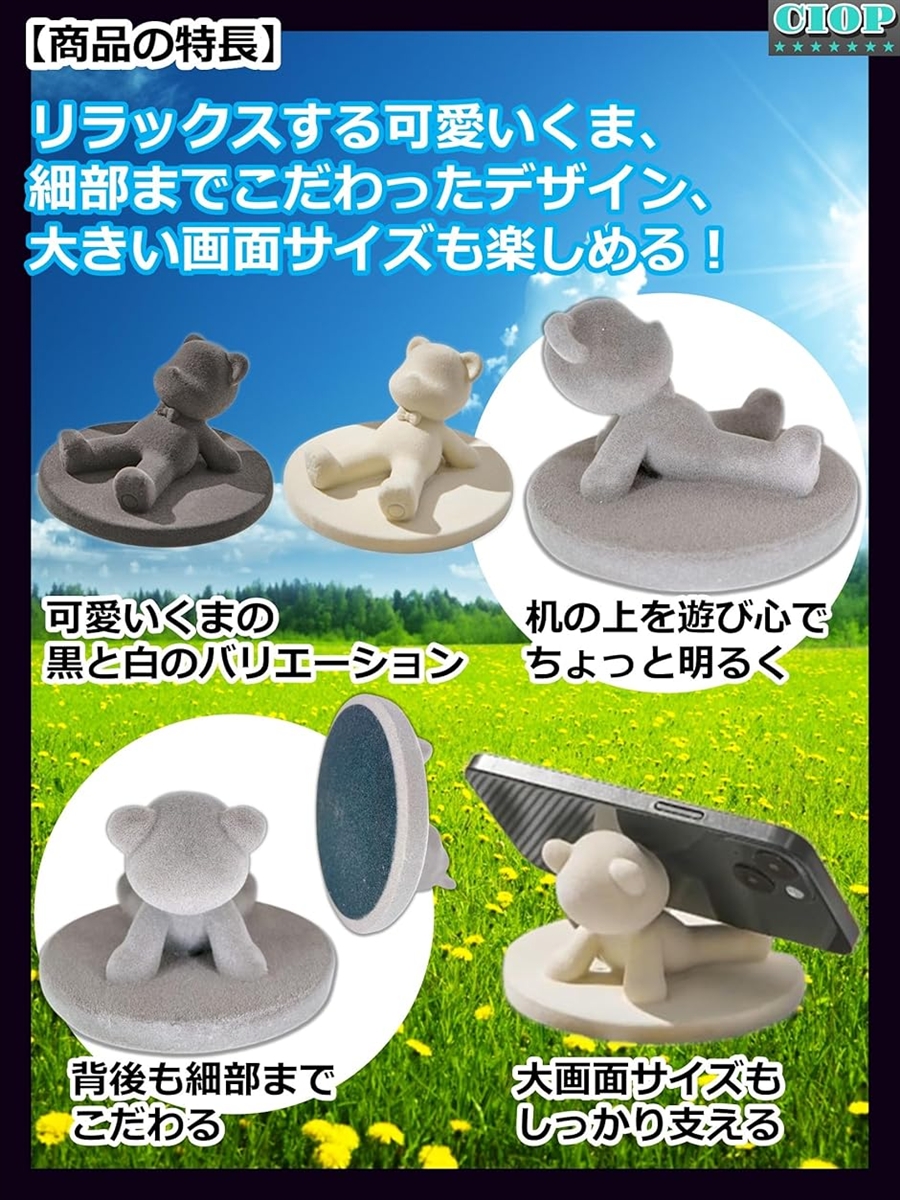 - バリエーションコード : 2brypk4xv1商品コード2bu1hk10d0商品名可愛い くま の スマホスタンド リラックスタイプ ブラック 熊好きさんへのプレゼントに最適。 デスクを癒すおしゃれかわいいインテリア 卓上 携帯 iphone/galaxy/pixel/xperia/aquos対応 ブラック 01ブランドCIOP(シオップ)「スペック」 サイズ:奥行き10cmx横10cmx高さ6cm / 重さ:約180g / カラー:ブラック / 材質:合成樹脂 / 機能・用途:スマホスタンド、携帯スタンド、スマホ立て / 生産国:中国「かわいいくまデザインでデスクを癒し空間に」:思わず笑顔になるキュートな くま モチーフのスマホスタンド。優しくコミカルで かわいい リラックスポーズの起毛感のある くま があなたのスマホをがんばってやさしく支えてくれます。「高い安定性のある設計」:安定している設計なのでiPhoneや様々なスマートフォンを安心してお使いいただけます。また縦置きでもお使いいただけます。ただし、iPadなどの大画面サイズのタブレットパソコンなどはバランスが悪くなり支えられず、お使いいただけない場合もございます。「高品質な樹脂を採用」:高品質な合成樹脂を採用することにより、割れにくく長持ちする素材なので、実用性も〇。また 可愛い リラックスポーズの くま を細部までこだわることができ、手作業でカラーリングすることでバランスよく仕上げています。「デスクに映えるおしゃれインテリア雑貨」:優しいカラーと起毛感のあるやさしい質感で、オフィスやお部屋のアクセントに。子供部屋やオフィスをはじめ、どこに置いても気分はわくわく楽しくなるオーナメントです。キッチン、ベッドサイドテーブル、ダイニングテーブル、デスク、玄関、お風呂、洗面台、トイレなど。「プレゼントに最適(気泡緩衝材梱包)」誕生日、出産記念・子どもの誕生日、就職・転職・退職祝い、引越し祝い・新築祝い、お正月、バレンタインデー、ひな祭り、ホワイトデー、母の日、父の日、七夕、敬老の日、クリスマス、くま好きさんへのプレゼントに最適です。「様々なスマホサイズに対応」: Apple iPhone ( iPhone3 / iPhone4 / iPhone5 / iPhone6 / iPhone7 / iPhone8 / iPhone9 / iPhoneX / iPhone11 / iPhone12 / iPhone13 / iPhone14 / iPhone15 / iPhone16 / iPhone17 / iPhoneSE 第1~第3世代 ), Samsung ( GalaxyS / GalaxyZ / GalaxyA ) , Google ( Pixel8 / Pixel9 ) , Sony ( Xperia1VII / Xperia1VI ) , SHARP (AQUOS R9) など。あらゆる機種でお使いいただけます。「取り扱い」:本製品が届きましたら箱から取り出し、異物はないかご確認いただき、スマホをセットしお使いください。メモスタンドや写真立てなど、使い方もご想像しながら自由に楽しんいただけます。またもし若干のにおいが気になりましたら、ご使用前に水洗いまたは1~2日水に浸した後、天日干ししてください。不快になるようなにおいはほとんど無くなります。「新品・海外輸入品」:すべて「*新品」です。海外輸入品のため、傷、色むら、しわが若干あったり、カラーやサイズなどが若干異なったりする場合がございます。綺麗な状態で保管しておりますが、神経質な方はご購入をお控えください。また画像は実際の商品に近い色を再現しておりますが、お客様のご覧になられているモニターによっては色味が異なる場合がございます。ご了承ください。※ 他ネットショップでも併売しているため、ご注文後に在庫切れとなる場合があります。予めご了承ください。※ 品薄または希少等の理由により、参考価格よりも高い価格で販売されている場合があります。ご注文の際には必ず販売価格をご確認ください。※ 沖縄県、離島または一部地域の場合、別途送料の負担をお願いする場合があります。予めご了承ください。※ お使いのモニタにより写真の色が実際の商品の色と異なる場合や、イメージに差異が生じることがあります。予めご了承ください。※ 商品の詳細(カラー・数量・サイズ 等)については、ページ内の商品説明をご確認のうえ、ご注文ください。※ モバイル版・スマホ版ページでは、お使いの端末によっては一部の情報が表示されないことがあります。すべての記載情報をご確認するには、PC版ページをご覧ください。