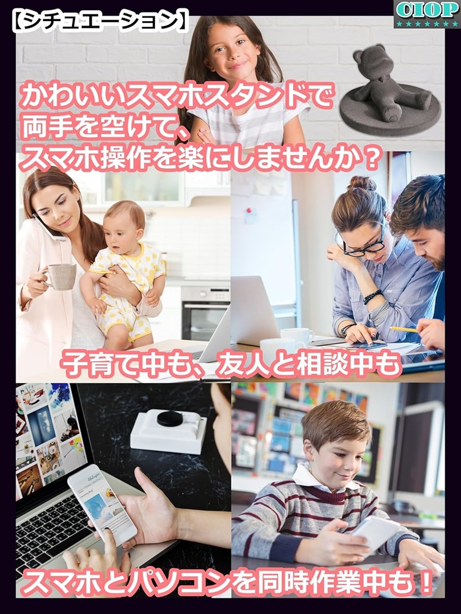 「かわいいくまデザインでデスクを癒し空間に」:思わず笑顔になるキュートな くま モチーフのスマホスタンド。