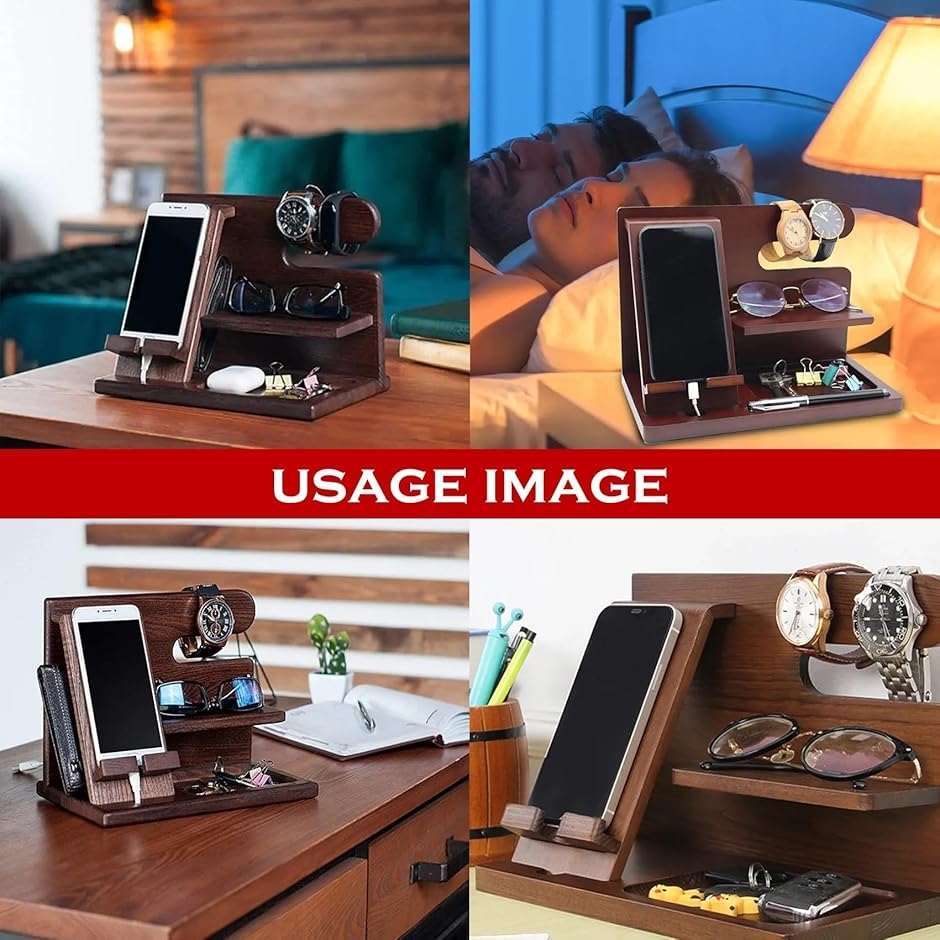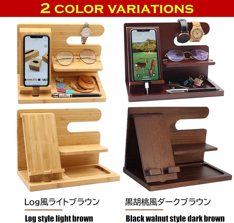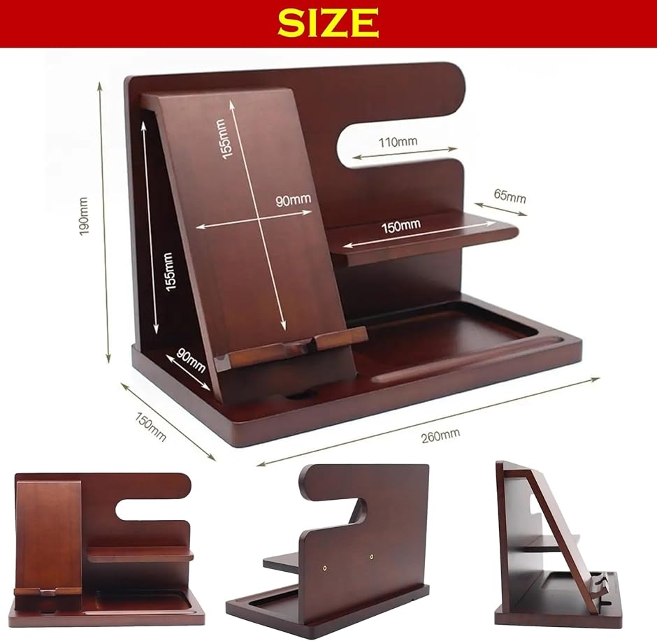 スマホスタンド 卓上 木製 デスクオーガナイザー おしゃれ 携帯 ガジェット 小物 置き 収納(黒胡桃風ダークブラウン)