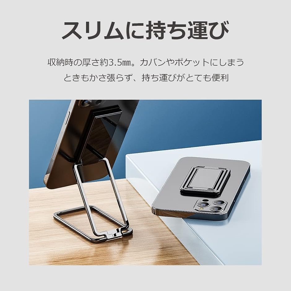 - 商品コード2b211nj8oh商品名スマホ リング 薄型 スマホグリップ 折りたたみ 四角 折り畳み 360度 回転 縦置き 横置き スマホ スタンド 軽量ブランドlifactlab.カラーブラック「縦横両方OK」縦位置OKでショートも見やすい。回転するピボットと折りたたまれた枠を展開することで縦位置でも横位置でも視聴可能。角度調整も自由自在であらゆるメディアの視聴を最適な画面位置で楽しめます。「収納時はとてもスリム」収納時の厚さ約3.5mmでスタンドを使用しないときも邪魔になりにくい設計。カバンやポケットにしまうときも嵩張らず、持ち運びも便利です。「幅広い機種に対応」スマートホンはもちろん、8.5インチ程度までの小型のタブレットや、ほとんどのサイズの電子書籍リーダーに対応。回転部はマグネットに対応しており車載用のホルダーなど市販のマグネットホルダーにも対応します。「本体仕様」素材:亜鉛合金 スチール 寸法:縦約70mm 横約41mm 厚さ約3.5mm 重量:約43.5g※ 他ネットショップでも併売しているため、ご注文後に在庫切れとなる場合があります。予めご了承ください。※ 品薄または希少等の理由により、参考価格よりも高い価格で販売されている場合があります。ご注文の際には必ず販売価格をご確認ください。※ 沖縄県、離島または一部地域の場合、別途送料の負担をお願いする場合があります。予めご了承ください。※ お使いのモニタにより写真の色が実際の商品の色と異なる場合や、イメージに差異が生じることがあります。予めご了承ください。※ 商品の詳細(カラー・数量・サイズ 等)については、ページ内の商品説明をご確認のうえ、ご注文ください。※ モバイル版・スマホ版ページでは、お使いの端末によっては一部の情報が表示されないことがあります。すべての記載情報をご確認するには、PC版ページをご覧ください。
