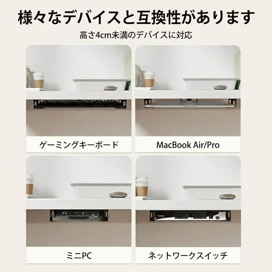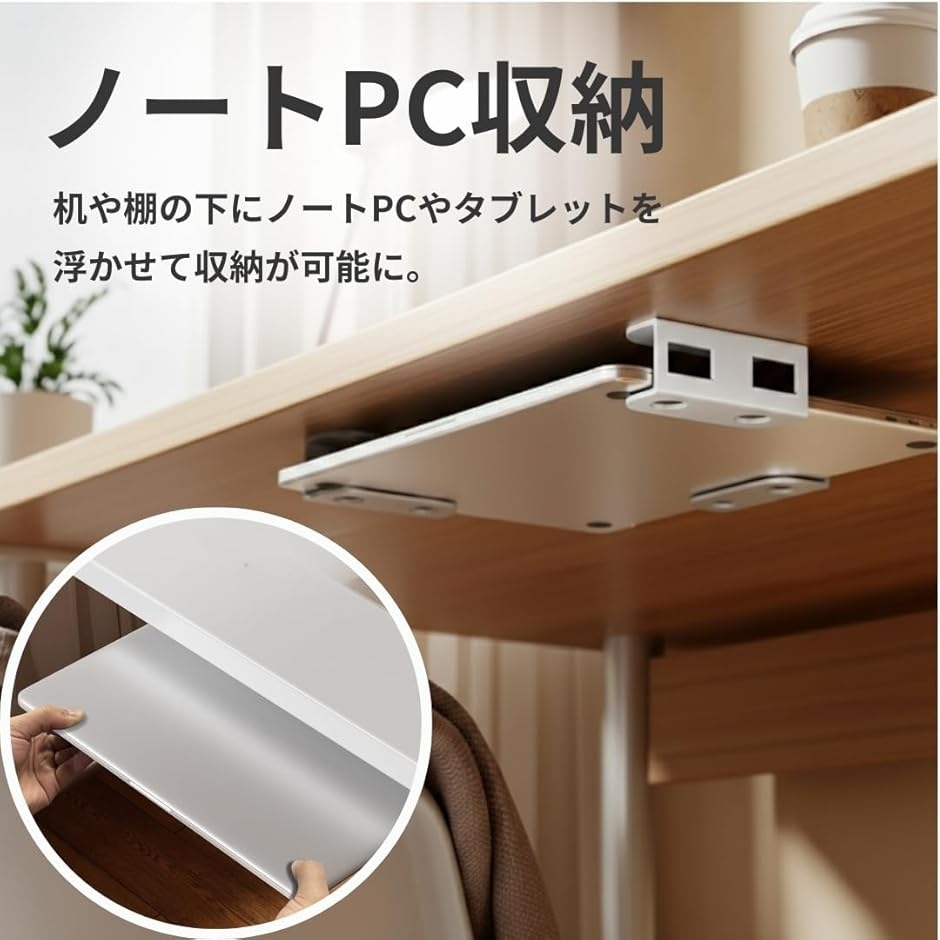 「ノートPC収納」机や棚の下にノートPCやタブレットを浮かせて収納が可能に。