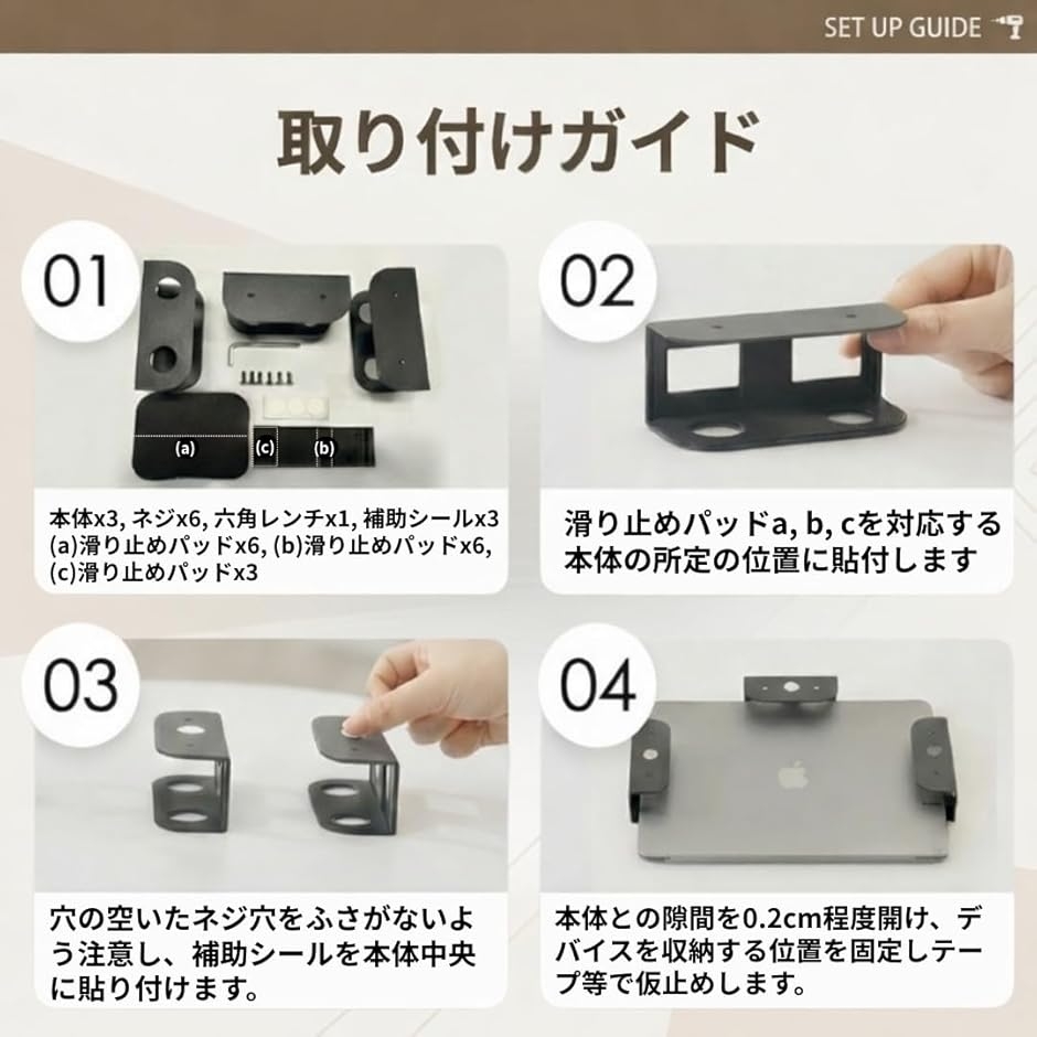 (1) 滑り止めパッド a・b・c を本体に貼る (2) 補助シールを本体中央に貼る (3) 取り付け位置を仮決めする(4) 机裏に押し付けて、補助シールを机側に転写 (5) ネジで本体を固定 (6) ネジ頭に丸い滑り止めパッドを貼る (7) デバイスを収納して完成