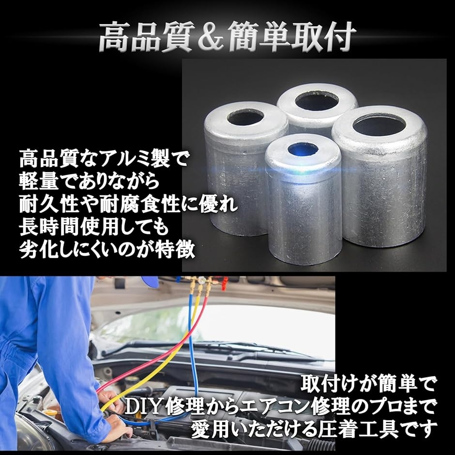 - 商品情報商品の説明主な仕様 R12やR134a冷媒用ホースの接続に最適なカシメキャップ2個セットになります。穴径9mm、12mm、14mm、14.5mmの4サイズを取り揃えてますので、様々なホースのサイズに対応いたします。コンプレッサーからクーラーまで、幅広いエアコンパーツの接続に使えるアルミ製スリーブ。ホースの接続部分をしっかり密閉し、ガス漏れ修理に最適!高品質なアルミ製で軽量でありながら耐久性や耐腐食性に優れ、長時間使用しても劣化しにくいのが特徴です。取付けが簡単でDIY修理からエアコン修理のプロまで愛用いただける圧着工具です。