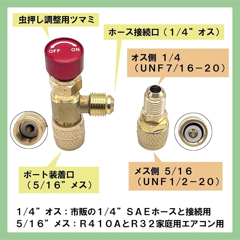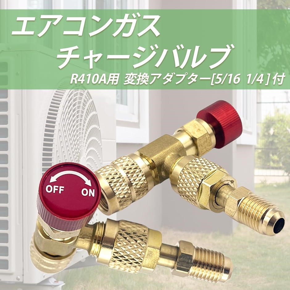 5/16インチと1/4インチの変換アダプター付きで様々なエアコンに対応いたします、