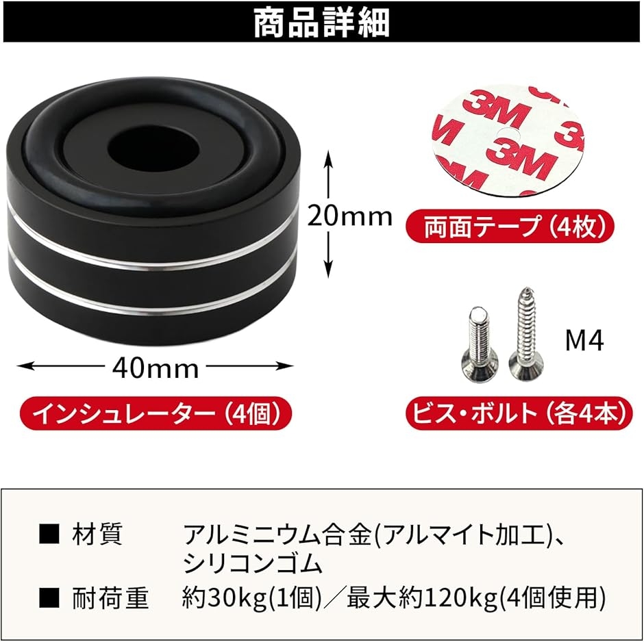 「商品詳細」サイズ:40x20mm|ネジ:M4サイズ|材質:アルミニウム合金(アルマイト加工)、シリコンゴム|耐荷重:約30kg(1個)・最大約120kg(4個使用時)