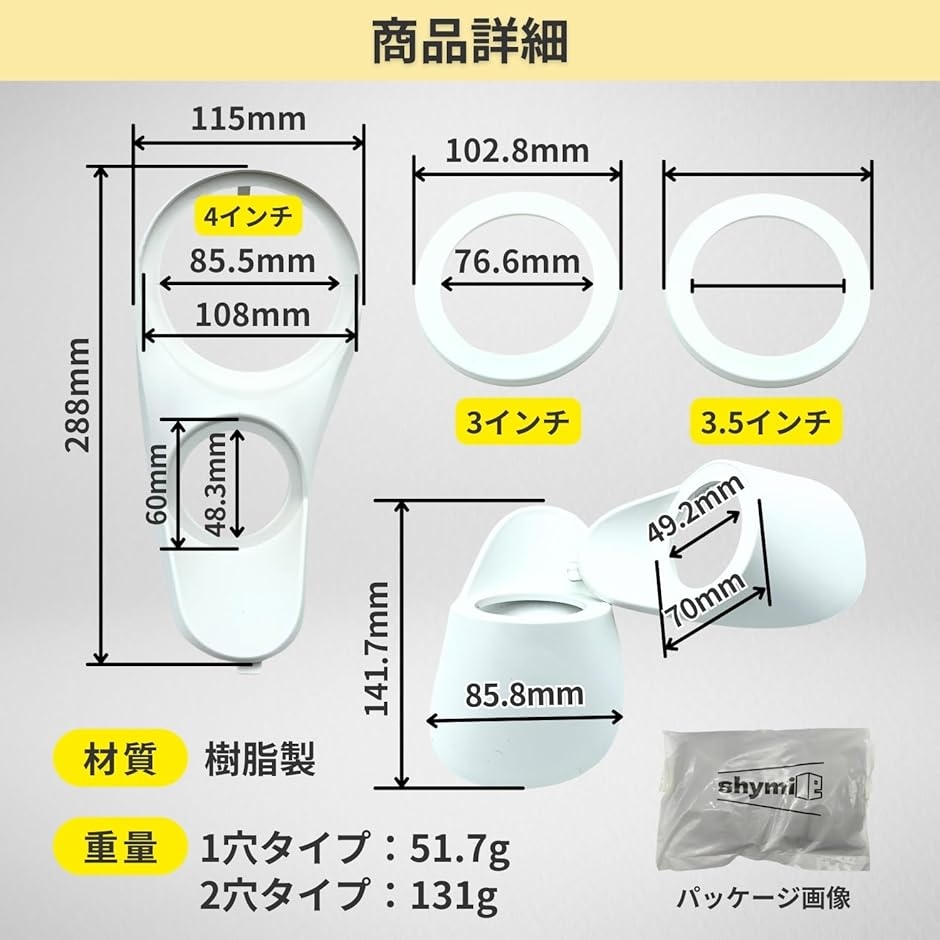 セット内容:ブラケット左右セット、アジャスター(2穴のみ) 素材:樹脂製 カラー:ホワイト(塗装可能) バリエーション:1穴タイプ、2穴タイプ 重量:1穴 51.7g/個 2穴 131g/個 サイズ(約):1穴 幅 86mm、長さ 142mm / 2穴 幅 115 mm、長さ 288mm アジャスター:3インチ 76.6mm (内径) 103mm (外径)、3.5インチ 1穴 穴径 49mm (内径) 70mm (外径) / 2穴 ツイータ・ - 楽天での商品説明(ホリック)