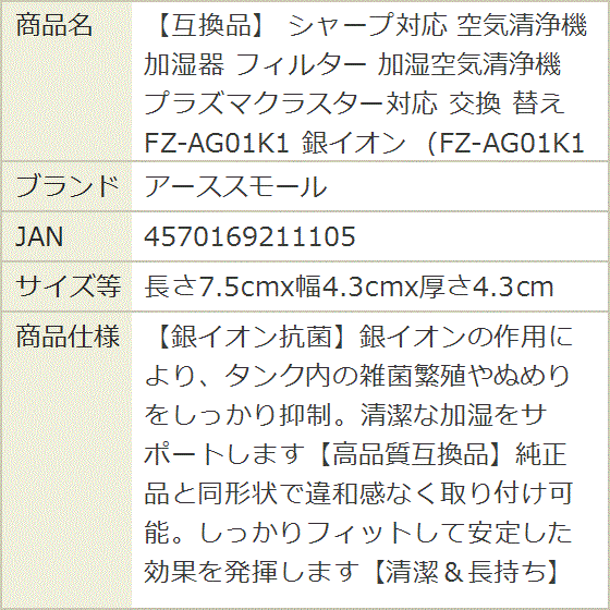【互換品】 シャープ対応 空気清浄機 加湿器 フィルター 加湿空気清浄機 交換 替え (長さ7.5cmx幅4.3cmx厚さ4.3cm)