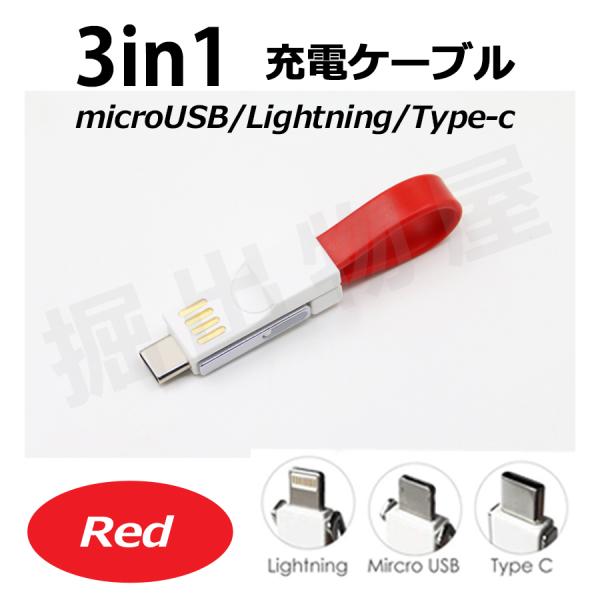 マルチコネクタ USBケーブル microUSB Lightning Type-C 3in1 (11cm) (カラー:レッド) コード 05642