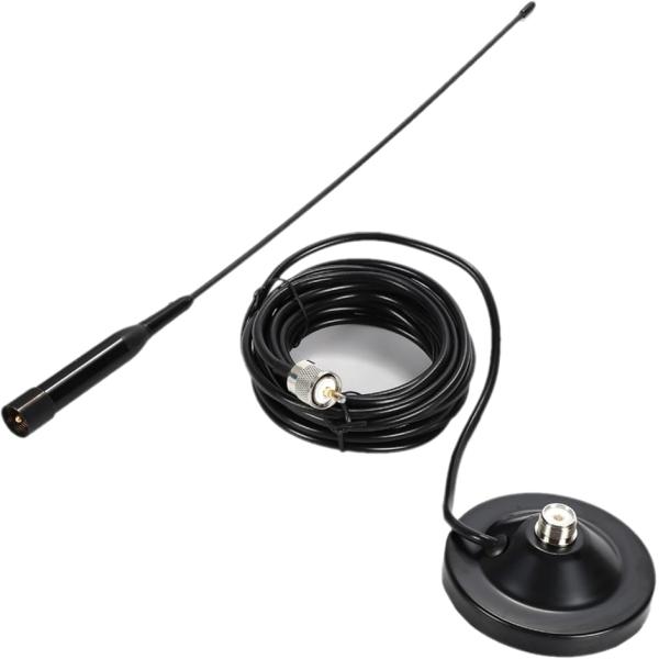 「商品概要」144/430MHz対応のモービルアンテナと、同軸ケーブル(5m)付きマグネット基台のセットです。
