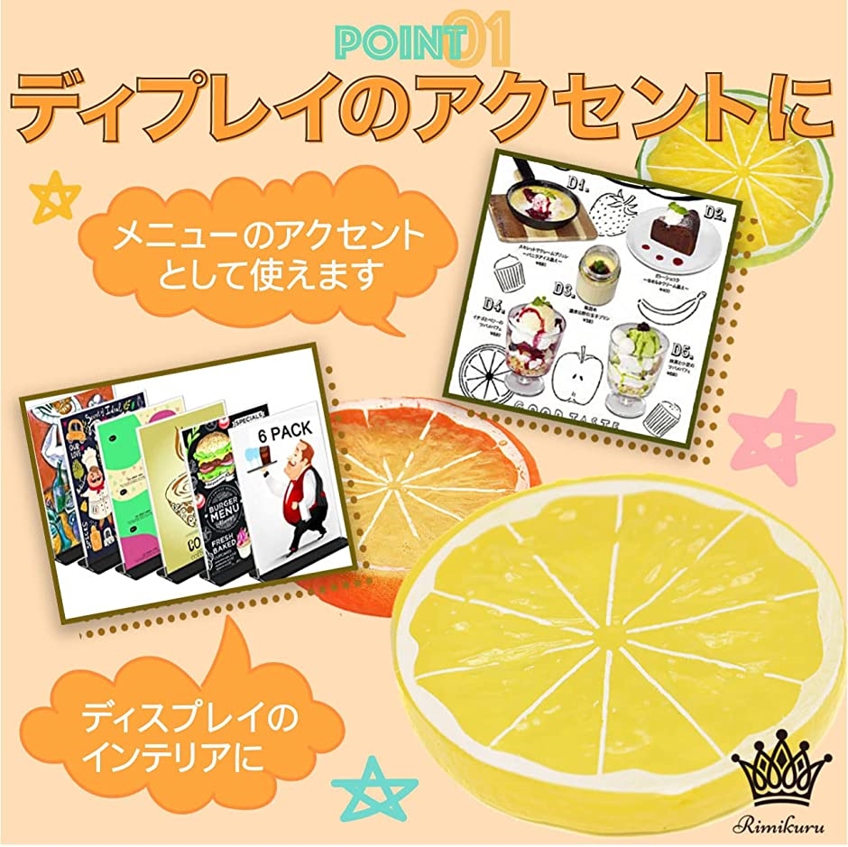 ・ディプレイのアクセントに:こちらの食品サンプル レモンスライスはスーパーや八百屋さん等の売り場のディスプレイのインテリアに、レストランや居酒屋等でレモンサワーといったお酒等、メニューのアクセントとしても使えます。