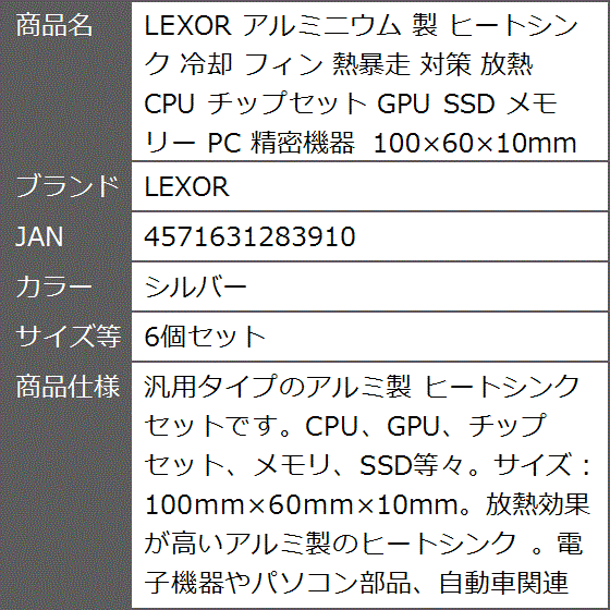 - バリエーションコード : 2b9uxxrwqg商品コード2b9ux09d4p商品名アルミニウム 製 ヒートシンク 冷却 フィン 熱暴走 対策 放熱 CPU チップセット GPU SSD メモリー PC 精密機器 100x60x10mm 6個セットブランドLEXORカラーシルバーサイズ等6個セット汎用タイプのアルミ製 ヒートシンクセットです。CPU、GPU、チップセット、メモリ、SSD等々。サイズ : 100mmx60mmx10mm。放熱効果が高いアルミ製のヒートシンク 。電子機器やパソコン部品、自動車関連装置などにも活躍します。熱に弱い電子パーツを高熱から守ります。効率的に放熱フィンを設けております。真空管アンプ 3Dプリンター のモーターの放熱などに最適です。ヒートシンクの効果を生かすため、冷却用のファン等で風を当てる・熱を吸い出し排出するとさらに効果が高まります。「注意事項」製造工程や輸送で出来た小傷・擦れ・汚れなどがある場合がございますが、放熱性能に関しましては問題はございません。予めご了承ください。※ 他ネットショップでも併売しているため、ご注文後に在庫切れとなる場合があります。予めご了承ください。※ 品薄または希少等の理由により、参考価格よりも高い価格で販売されている場合があります。ご注文の際には必ず販売価格をご確認ください。※ 沖縄県、離島または一部地域の場合、別途送料の負担をお願いする場合があります。予めご了承ください。※ お使いのモニタにより写真の色が実際の商品の色と異なる場合や、イメージに差異が生じることがあります。予めご了承ください。※ 商品の詳細(カラー・数量・サイズ 等)については、ページ内の商品説明をご確認のうえ、ご注文ください。※ モバイル版・スマホ版ページでは、お使いの端末によっては一部の情報が表示されないことがあります。すべての記載情報をご確認するには、PC版ページをご覧ください。バリエーション:4個or6個