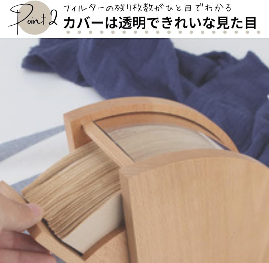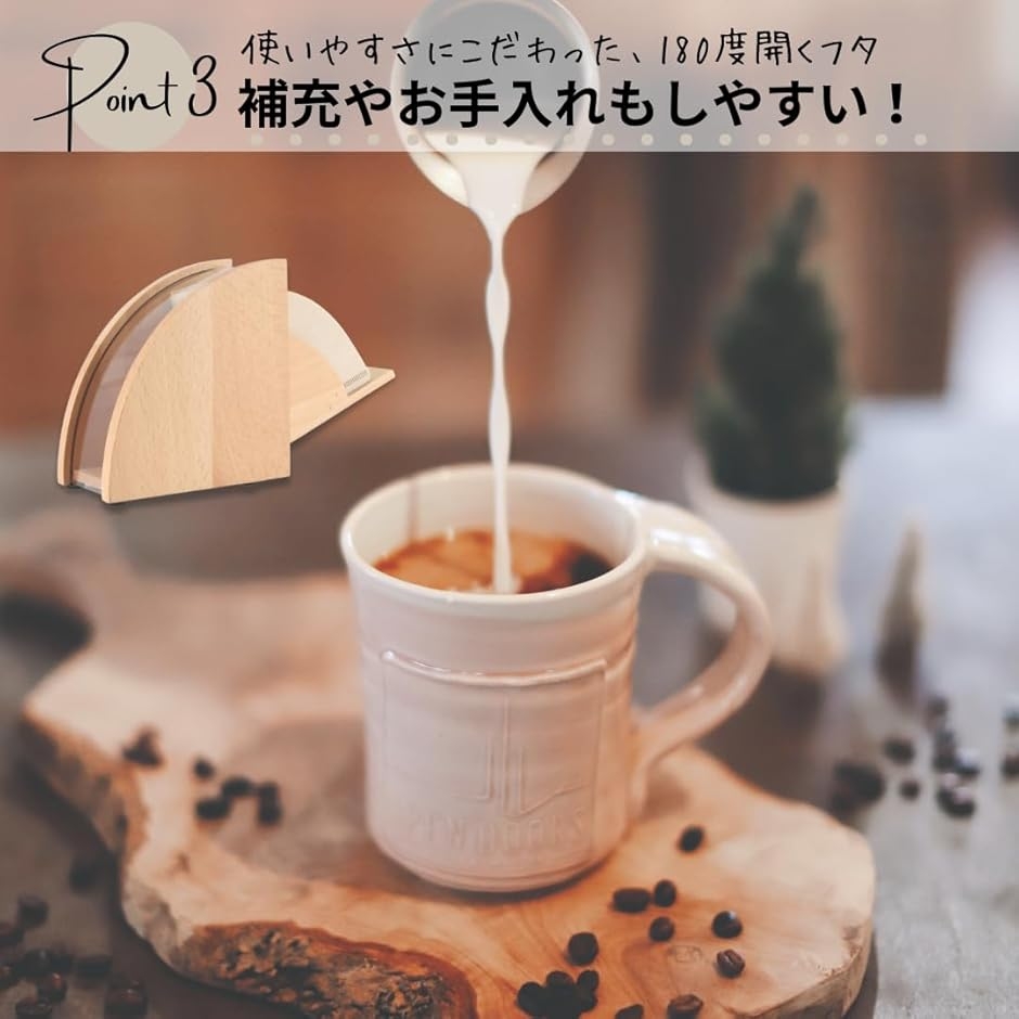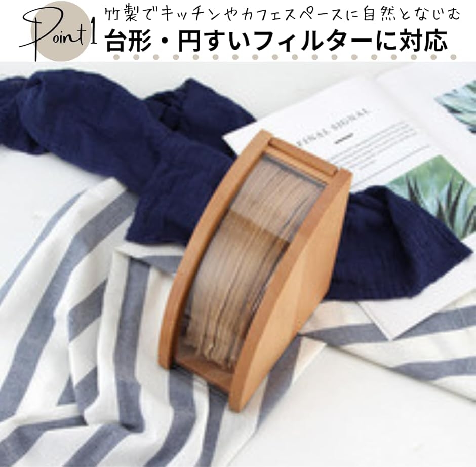 「台形・円すいフィルターに対応」台形タイプ・円すいタイプ、どちらのコーヒーフィルターもすっきり収納できる竹製のケースです。