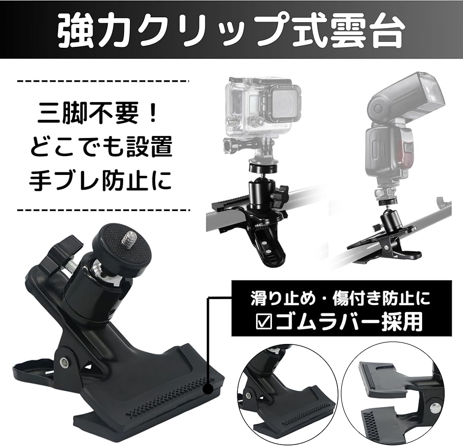 クリップ雲台 カメラ雲台 自由雲台 強力クリップ 360度回転 スマホ雲台 ミニ三脚 小型ライト ストロボ撮影 固定スタンド (ブラック)