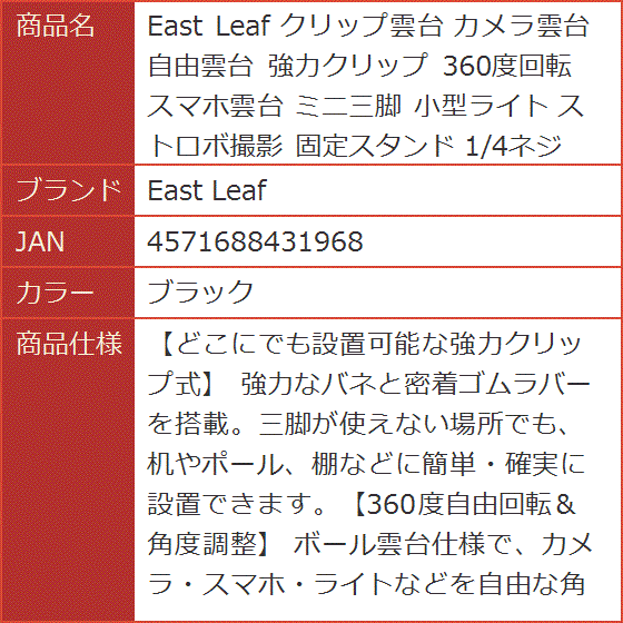 - 商品コード2bu8w8go41商品名クリップ雲台 カメラ雲台 自由雲台 強力クリップ 360度回転 スマホ雲台 ミニ三脚 小型ライト ストロボ撮影 固定スタンド 1/4ネジブランドEast Leafカラーブラック「どこにでも設置可能な強力クリップ式」 強力なバネと密着ゴムラバーを搭載。三脚が使えない場所でも、机やポール、棚などに簡単・確実に設置できます。「360度自由回転&角度調整」 ボール雲台仕様で、カメラ・スマホ・ライトなどを自由な角度で固定。Vlog撮影やライブ配信に最適です。「耐荷重アップ・安定設計」 強化版バネ採用で、最大耐荷重2kgを実現。従来品では不安だった重めの一眼レフや照明機器も安定固定できます。「挟み幅拡大モデル」 最大70mmまで対応可能な大型クリップ仕様。厚みのある机や棚にも幅広く対応し、取り付け場所の自由度が向上しました。「工具レス固定・素早くセッティング」 新設計ハンドル式ネジ採用で、六角レンチ不要。手回しだけでしっかり固定でき、屋外撮影や移動時にもストレスフリーです。「商品仕様」 材質 スチール+ABS樹脂+ゴムラバー、 カラー ブラック、 対応ネジ規格 1/4インチ、 耐荷重 最大2kg、 挟み込み範囲 約5cmまで、 重量 約200g「East Leafオリジナル」East Leafオリジナル梱包に迅速にお届けいたします。※ 他ネットショップでも併売しているため、ご注文後に在庫切れとなる場合があります。予めご了承ください。※ 品薄または希少等の理由により、参考価格よりも高い価格で販売されている場合があります。ご注文の際には必ず販売価格をご確認ください。※ 沖縄県、離島または一部地域の場合、別途送料の負担をお願いする場合があります。予めご了承ください。※ お使いのモニタにより写真の色が実際の商品の色と異なる場合や、イメージに差異が生じることがあります。予めご了承ください。※ 商品の詳細(カラー・数量・サイズ 等)については、ページ内の商品説明をご確認のうえ、ご注文ください。※ モバイル版・スマホ版ページでは、お使いの端末によっては一部の情報が表示されないことがあります。すべての記載情報をご確認するには、PC版ページをご覧ください。