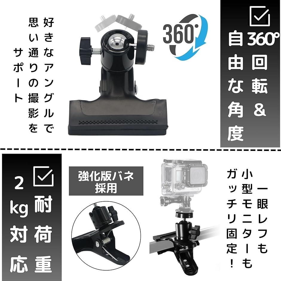 「360度自由回転&角度調整」 ボール雲台仕様で、カメラ・スマホ・ライトなどを自由な角度で固定。