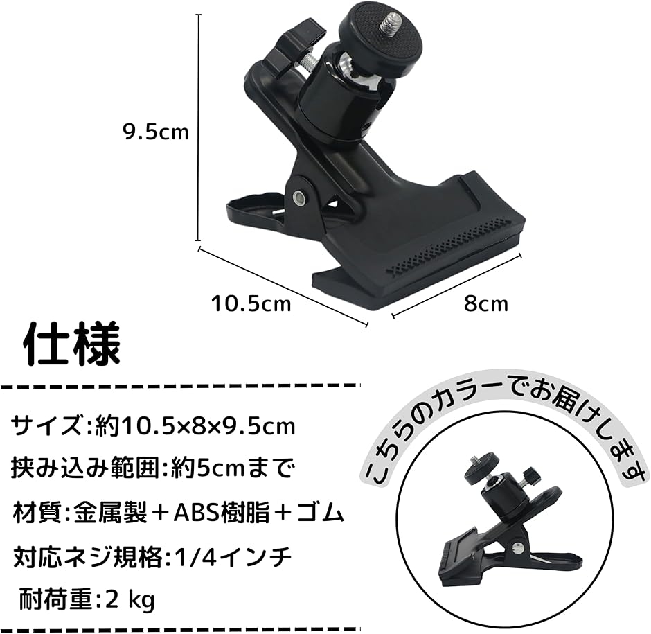 「商品仕様」 材質 スチール+ABS樹脂+ゴムラバー、 カラー ブラック、 対応ネジ規格 1/4インチ、 耐荷重 最大2kg、 挟み込み範囲 約5cmまで、 重量 約200g