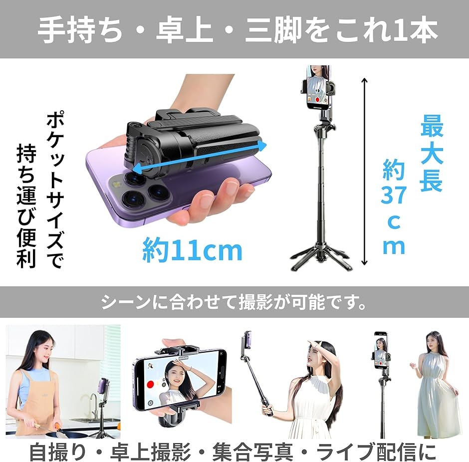 - 「ポケットに収まる“11cm”」旅行・お出かけに最適。収納時約11cmの超小型で、スマホより小さくカバンやポケットにスッと入ります。「手持ち・卓上・三脚をこれ1本」三脚一体型で手持ち/置き撮りに対応。ワンタッチで素早く展開。シーンに合わせて撮影が可能です。「安定・堅牢なつくり」要所にアルミ合金、太めの伸縮ポール採用。ガタつき防止設計でブレを抑え、動画撮影やライブ配信も安定。「“ミニでも実用”の37cm」伸ばすと最大約37cm。自撮り・集合・テーブル上の動画撮影やリモート会議まで、近距離~日常使いにちょうど良い長さ。「仕様」収納時サイズ:約11cm/最大長:約37cm、素材:アルミ合金/プラスチック、対応:スマホ(iPhone/Android対応)、カラー:ブラック※ 他ネットショップでも併売しているため、ご注文後に在庫切れとなる場合があります。予めご了承ください。※ 品薄または希少等の理由により、参考価格よりも高い価格で販売されている場合があります。ご注文の際には必ず販売価格をご確認ください。※ 沖縄県、離島または一部地域の場合、別途送料の負担をお願いする場合があります。予めご了承ください。※ お使いのモニタにより写真の色が実際の商品の色と異なる場合や、イメージに差異が生じることがあります。予めご了承ください。※ 商品の詳細(カラー・数量・サイズ 等)については、ページ内の商品説明をご確認のうえ、ご注文ください。※ モバイル版・スマホ版ページでは、お使いの端末によっては一部の情報が表示されないことがあります。すべての記載情報をご確認するには、PC版ページをご覧ください。小さく持ち歩ける自撮り棒は便利。でも「ぐらつく」「固定が甘い」「卓上で自立しない」——そんな不満、ありませんか? East Leafのミニ三脚一体モデルは、収納11cmの超小型ながら、4本脚の安定脚でしっかり固定。最大37cmまで伸ばして自撮り・集合・Vlog・オンライン会議までこれ1本。アルミ合金や太径ポールなど堅牢素材の採用で、ミニでも頼れる撮影体験を。*本品はリモコン無しです。近距離~卓上撮影が中心の方に最適。