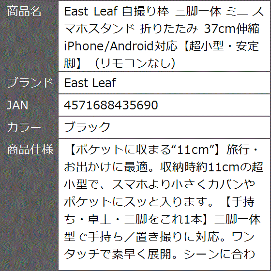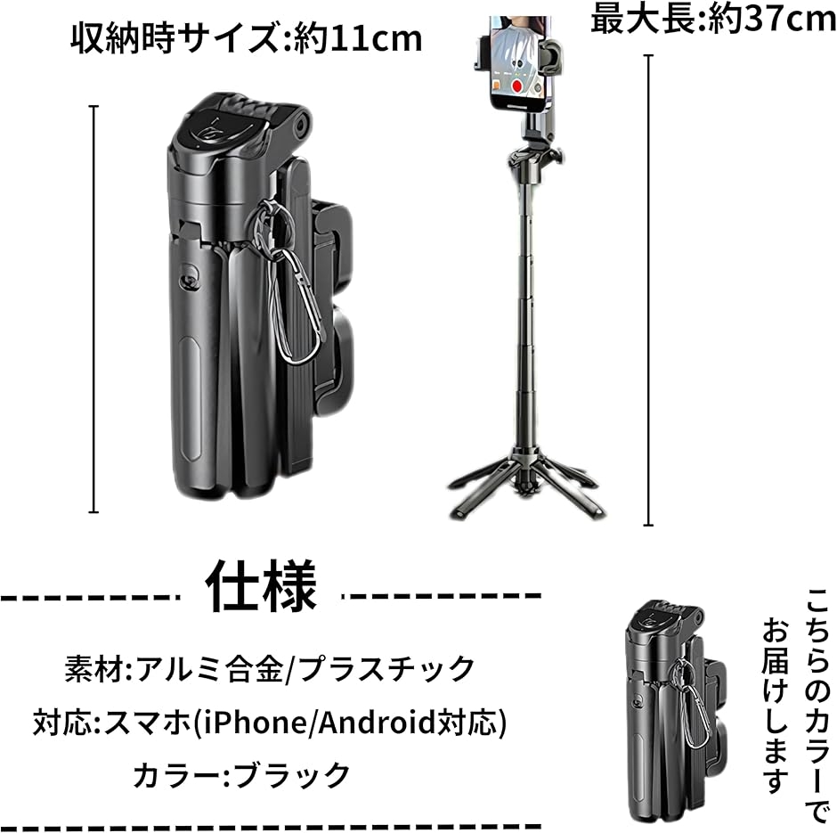 「仕様」収納時サイズ:約11cm/最大長:約37cm、素材:アルミ合金/プラスチック、対応:スマホ(iPhone/Android対応)、カラー:ブラック - 楽天での商品説明(エムラインストア)