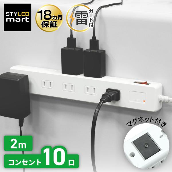 電源タップ 2m マグネット付き 雷ガード ブレーカー ほこり防止シャッター 10個口 白 ホワイト YTP-10W-2M STYLED
