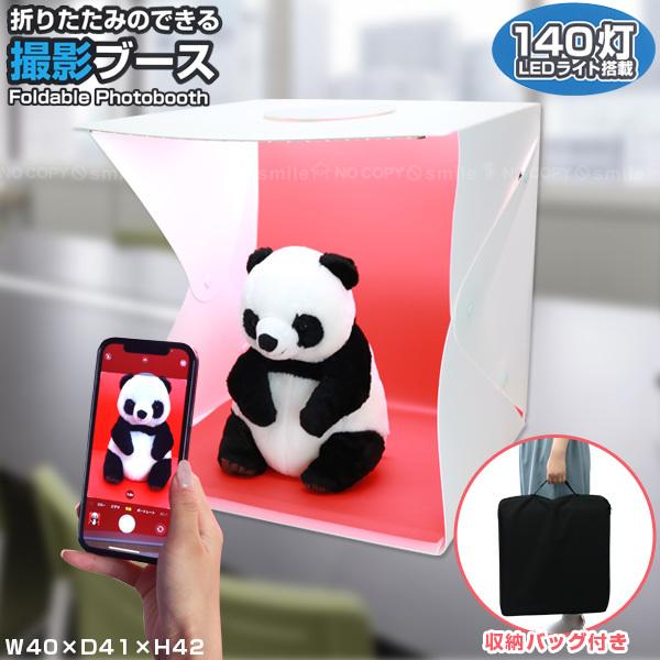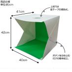 - 商品説明★ 誰でも簡単!明るくキレイに写真が撮れるミニスタジオ!!★ 真上からの撮影にも対応。着脱可能な蓋付き。★ 折りたためてコンパクト。省スペース保管が可能!!★ 140灯LEDライト搭載★ ライトカラー3色切り替え機能!★ スイッチ操作で簡単調節。10段階の調光機能付き。★ USB充電式【使用上の注意】・火気または高温のもに近づけないでください。火災及び製品の性能が劣化する恐れがあります。・奥側か手前側のLEDどちらか一方にUSBケーブルを接続していただければ2列とも点灯します。スペック* 商品サイズ(組立時)(mm):W400×D410×H420mm* 重量(g):1030g* 材質:[本体]ポリプロピレン、[背景シート]PVC、[収納バッグ]ポリエステル* 生産国:中国* 付属品:本体×1、背景シート×4、収納バッグ×1、調光コントローラー付きUSBケーブル×1、取扱説明書* 保証書:6か月