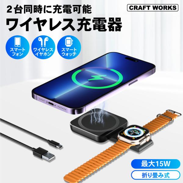 ワイヤレス充電器 折り畳み式 最大15W 2in1 最新 充電スタンド 急速充電 iPhone Android Airpods Apple watch