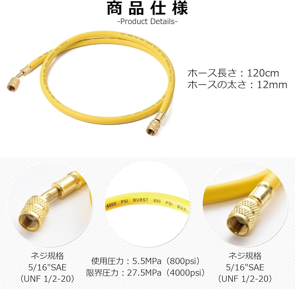- バリエーションコード : 2b8tj1c3x0商品コード2b8tjv148h商品名R410A R32用 エアコン ガス チャージホース 120cmブランドHOTEISONカラーイエロー・R410A, R32 ルーム エアコン用のガスチャージホースです。・チャージホース両端のアダプタが5/16SAEであり、R410A,R32冷媒対応のエアコンの室外機に変換アダプタなしで接続できます。・ねじサイズ: 5/16SAE(UNF 1/2-20) x 5/16SAE(UNF 1/2-20)・ホース長さ : 120cm・規定圧力: 使用圧力 5.5MPa (800psi)/ 限界圧力 27.5MPa(4000psi)※ 他ネットショップでも併売しているため、ご注文後に在庫切れとなる場合があります。予めご了承ください。※ 品薄または希少等の理由により、参考価格よりも高い価格で販売されている場合があります。ご注文の際には必ず販売価格をご確認ください。※ 沖縄県、離島または一部地域の場合、別途送料の負担をお願いする場合があります。予めご了承ください。※ お使いのモニタにより写真の色が実際の商品の色と異なる場合や、イメージに差異が生じることがあります。予めご了承ください。※ 商品の詳細(カラー・数量・サイズ 等)については、ページ内の商品説明をご確認のうえ、ご注文ください。※ モバイル版・スマホ版ページでは、お使いの端末によっては一部の情報が表示されないことがあります。すべての記載情報をご確認するには、PC版ページをご覧ください。十分な耐圧を確保。**ガスチャージホースの仕様**R410a、R32用のガスチャージホース黄色(120cm)になります。ホースの使用圧力は、5.5MPaとなっており、R32ガスを使用するエアコンのガス補充にも、安心してお使いいただけます。「耐圧」*使用圧力 5.5MPa*限界圧力 27.5MPa変換アダプタ不要。。 室外機のポートに直接接続できます。**ガスチャージホースの仕様**ガスチャージホース両端のねじ規格は、5/16SAE(ユニファイねじ 1/2-20)となっており、R410a、R32用のエアコン室外機のポートに直接接続できます。~ご使用時の注意点~「ご使用時には以下の点にご注意ください。」*当商品は輸入品であり、室外機のポートへ接続する際、手締めだけではチャージホース内にガスは充填されません。*手締めの後、ペンチ等を用いて更に締めこむ事で、ホース側のテフロンが潰れ、フレア加工された室外機のポートに密着すると共に、虫押し部が室外機側ポートのバルブを押し込み、ガスが充填されます。~最後に~**お客様へ**当商品の他にも、ガスチャージ作業を安全に行えるガスチャージバルブや、各種ホースを取り扱っておりますのであわせてご覧ください。