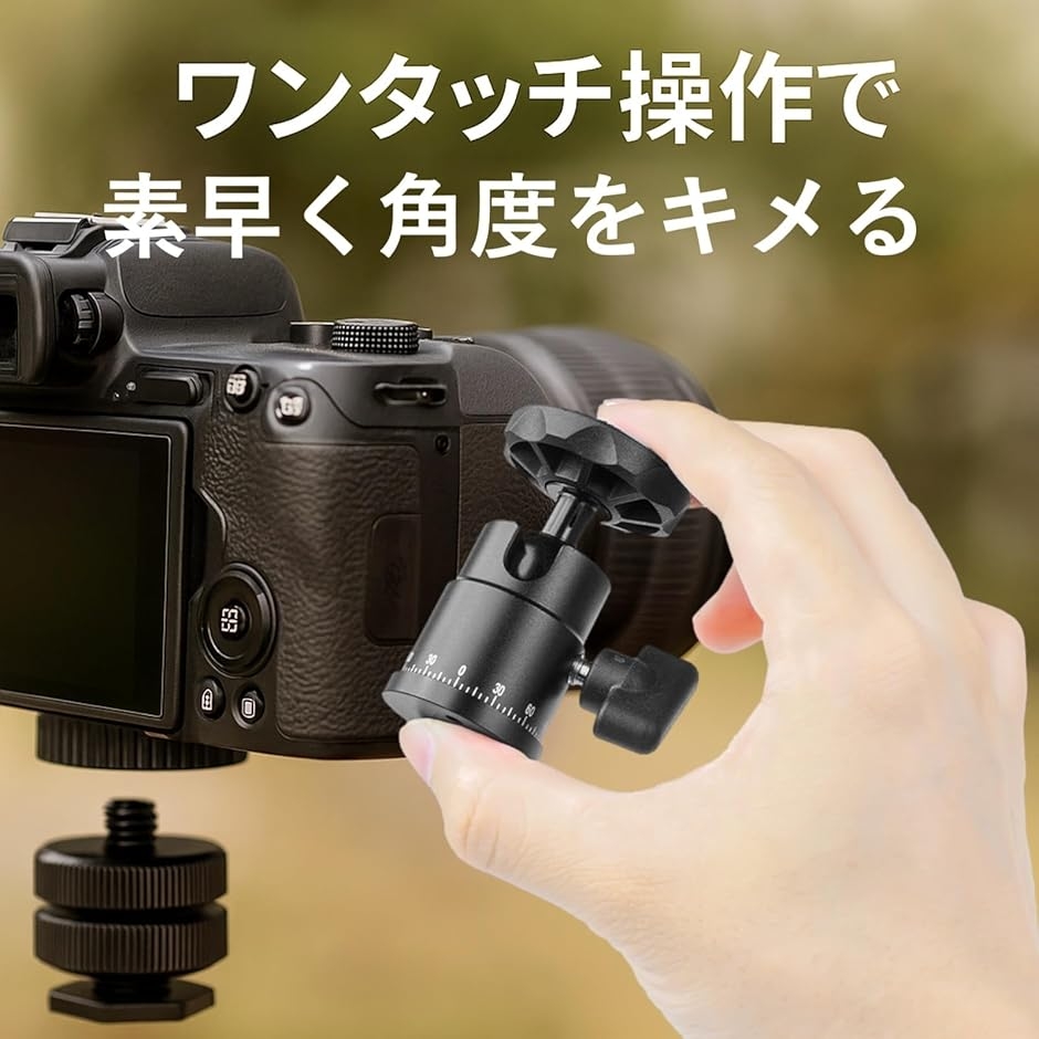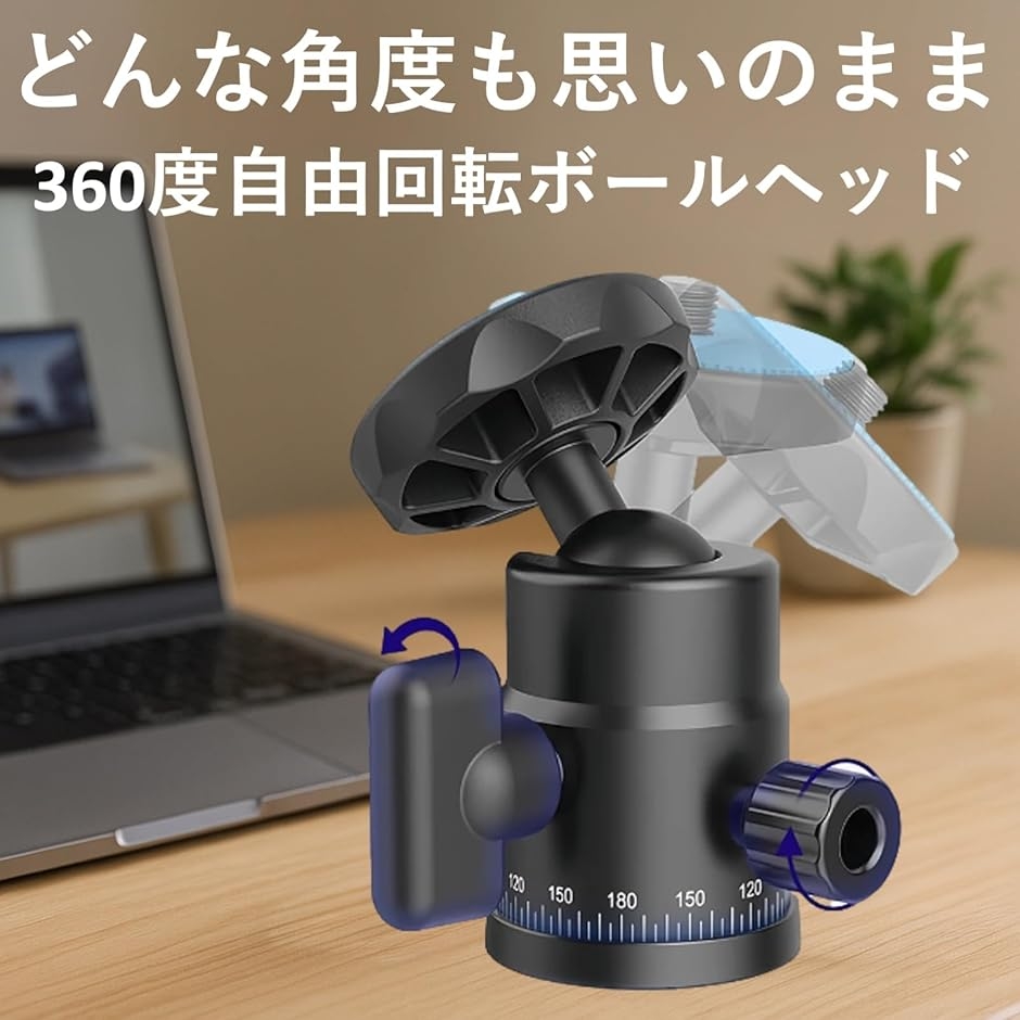 全方向に回転可能な360°回転機能を備え、上下・左右・斜めの角度調整でき、どんな角度からでも思い通りのアングルで撮影可能なボールヘッドです。
