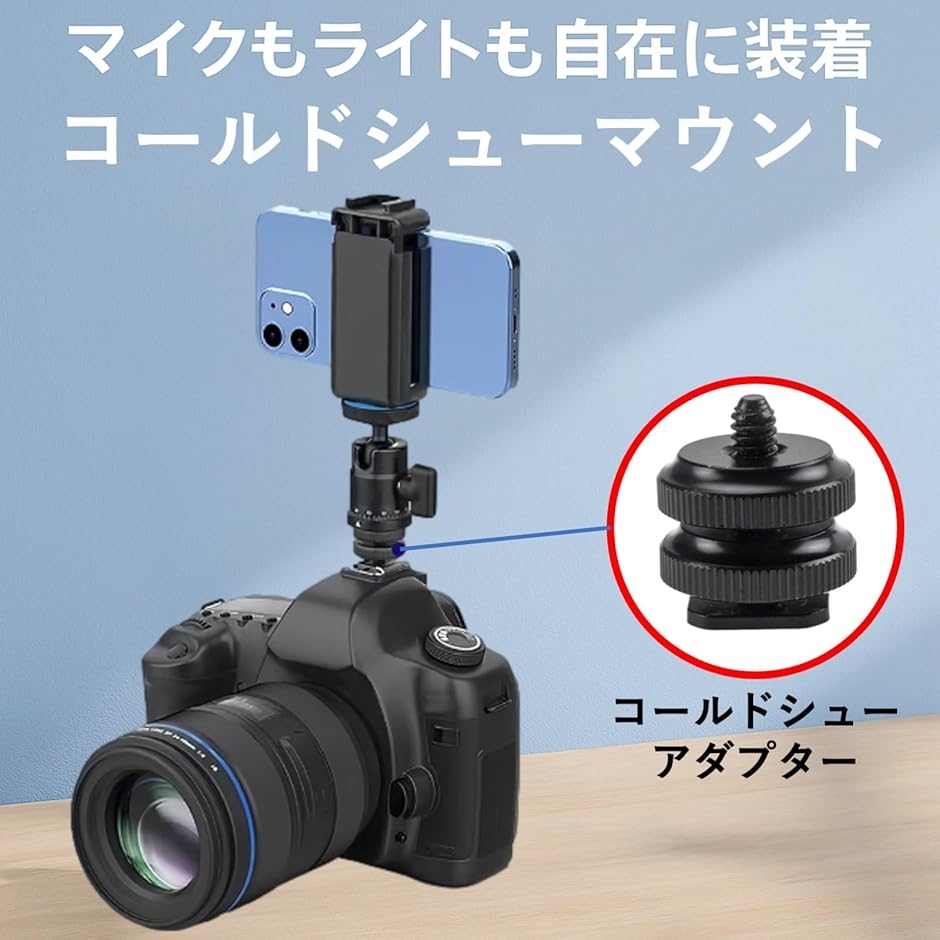 - 全方向に回転可能な360°回転機能を備え、上下・左右・斜めの角度調整でき、どんな角度からでも思い通りのアングルで撮影可能なボールヘッドです。撮影スタンドやミニ三脚との組み合わせにより風景撮影、パノラマ撮影、動画撮影など、自由雲台としてスムーズな操作を行うことが可能です。耐荷重2kgの高強度アルミ合金製で、DSLRカメラやミラーレス、一眼レフ、ビデオカメラをしっかり固定し、撮影中の揺れやブレを抑え、安定した撮影を行うことができます。屋外撮影や旅行時でも安心して使用できる頑丈な構造です。コールドシューマウントを付属しており、マイク・LEDライトなどのアクセサリーを簡単に装着することが可能です。動画撮影、配信、映像制作、Vlog撮影、ライブ配信など幅広い用途にお使いいただくことができます。シンプルで滑らかな回転ノブにより、角度調整が素早く行えます。直感的な操作でセッティング時間を短縮し、撮影のテンポを損なわず、構図変更も直感的に行えますので、決定的な瞬間を逃さないよう撮影に集中することができます。標準的な1/4ネジを採用しており、ほとんどの三脚、一脚、撮影スタンド、撮影リグなど幅広いカメラ機器にお使いいただくことができます。トラベル三脚や卓上ミニ三脚とも組み合わせやすく、持ち運びにも便利です。高品質アルミ合金をCNC精密加工で仕上げ、耐久性、耐摩耗性と軽量性を実現しております。軽量ながらもしっかりとした作りで、プロフェッショナルな撮影にも応える質感と堅牢性を備えています。軽量設計でバッグに入れてもかさばらず、スタジオ撮影からアウトドア、旅行先での動画撮影など屋外撮影や旅行まで、あらゆる場面でお使いいただけます。コンパクトながらプロ仕様の安定感を実現し、映像クオリティを格上げします。サイズ(約): 本体 62.5 x 48 x 41mm, コールドシューマウント 18 x 27.5mm※ 他ネットショップでも併売しているため、ご注文後に在庫切れとなる場合があります。予めご了承ください。※ 品薄または希少等の理由により、参考価格よりも高い価格で販売されている場合があります。ご注文の際には必ず販売価格をご確認ください。※ 沖縄県、離島または一部地域の場合、別途送料の負担をお願いする場合があります。予めご了承ください。※ お使いのモニタにより写真の色が実際の商品の色と異なる場合や、イメージに差異が生じることがあります。予めご了承ください。※ 商品の詳細(カラー・数量・サイズ 等)については、ページ内の商品説明をご確認のうえ、ご注文ください。※ モバイル版・スマホ版ページでは、お使いの端末によっては一部の情報が表示されないことがあります。すべての記載情報をご確認するには、PC版ページをご覧ください。(仕様)サイズ(約): 本体 62.5 x 48 x 41mm, コールドシューマウント φ18 x 27.5mm重量(約): 本体 70g, コールドシューマウント 15g材質: アルミ合金カラー: ブラック*モニターの環境により、色の見え方に若干差が生じる場合があります。