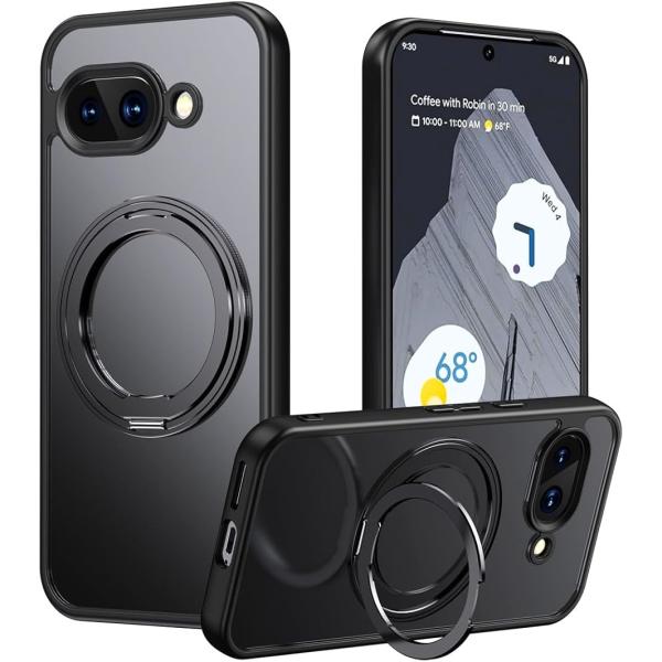 Google Pixel 9a ケース MagSafe対応 リング付き 360°回転スタンド 半透明マット 耐衝撃 指紋防止(ブラック)