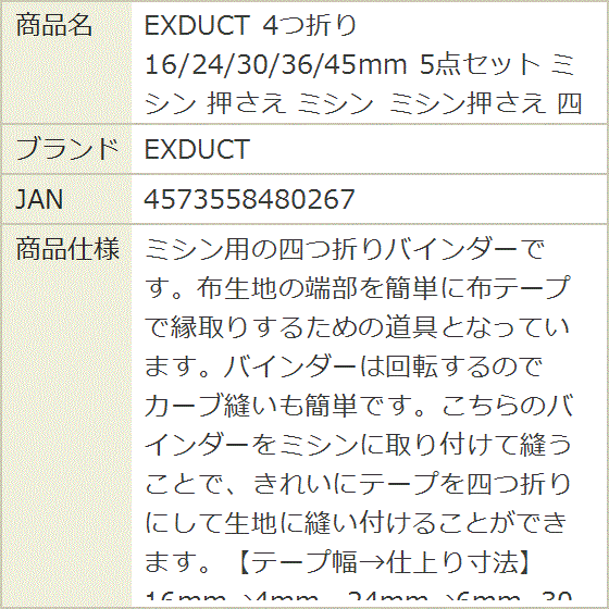 - バリエーションコード : 2bj0ioqlt6商品コード2b6k08lung商品名4つ折り 16/24/30/36/45mm 5点セット ミシン 押さえ ミシン ミシン押さえ 四つ折りバインダーブランドEXDUCTミシン用の四つ折りバインダーです。布生地の端部を簡単に布テープで縁取りするための道具となっています。バインダーは回転するのでカーブ縫いも簡単です。こちらのバインダーをミシンに取り付けて縫うことで、きれいにテープを四つ折りにして生地に縫い付けることができます。「テープ幅>仕上り寸法」16mm>4mm, 24mm>6mm, 30mm>8mm, 36mm>10mm, 45mm>13mm *サイズはおおよその値です※ 他ネットショップでも併売しているため、ご注文後に在庫切れとなる場合があります。予めご了承ください。※ 品薄または希少等の理由により、参考価格よりも高い価格で販売されている場合があります。ご注文の際には必ず販売価格をご確認ください。※ 沖縄県、離島または一部地域の場合、別途送料の負担をお願いする場合があります。予めご了承ください。※ お使いのモニタにより写真の色が実際の商品の色と異なる場合や、イメージに差異が生じることがあります。予めご了承ください。※ 商品の詳細(カラー・数量・サイズ 等)については、ページ内の商品説明をご確認のうえ、ご注文ください。※ モバイル版・スマホ版ページでは、お使いの端末によっては一部の情報が表示されないことがあります。すべての記載情報をご確認するには、PC版ページをご覧ください。