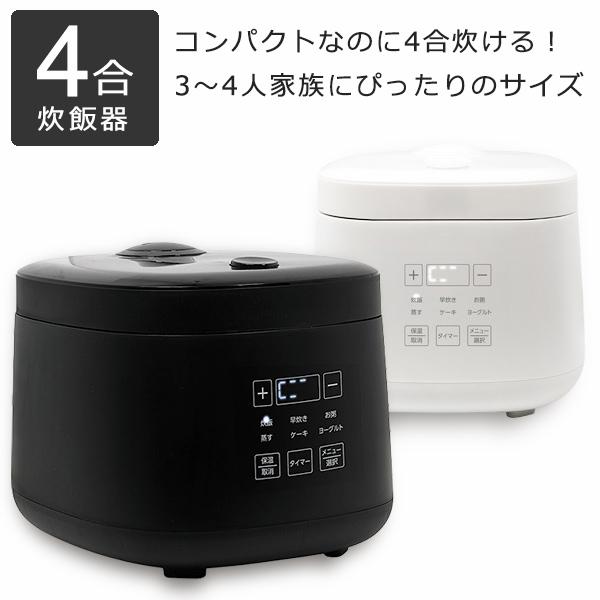 - 商品説明最大炊飯量:4合通常炊飯/早炊き/お粥/蒸し料理/ケーキ/ヨーグルト/保温■多彩な調理方法に対応 多機能調理炊飯器炊飯器としての通常炊飯・早炊きのほか、お粥、蒸し料理、ケーキ、ヨーグルトに最適化されたメニューがプリセットされています。簡単操作で火加減の見張りをすることなく、美味しい料理が出来上がります。また、保温機能も備えているので、温かい料理を好きなときに楽しめます。■9種のプリセットメニュー通常炊飯/早炊き/お粥/スープ/煮る/ヨーグルト/ケーキ/蒸す/保温■温度センサーが調理温度を徹底管理食材のおいしさを引き出します■お手入れが楽なタッチパネル■コンパクトサイズなのに4合炊ける12時間までの保温設定可能■内蓋は外して洗えます■調理に役立つ蒸し皿、しゃもじ、軽量カップ付1.蒸し皿 2.釜 3.電源コード(1m) 4.しゃもじ5.軽量カップ スペック【サイズ】本体サイズ:約W230×D265×H205mmパッケージサイズ:W295×D225×H228mm【重量】重量:約1.7kg【素材・成分】PP、アルミ【仕様】電源:AC100V 50/60Hz消費電力:400W炊飯時:1回あたり385Wh保温時:1時間あたり6Wh予約時:1時間あたり0.26Wh待機時:1時間あたり0.26Wh区分名:E年間消費電力:118.08kW/年タイプ:マイコン式定格炊飯量:4合内釜:アルミ、フッ素コーティング蒸発水量:28g機能:炊飯/早炊き/お粥/蒸す/ケーキ/ヨーグルト/保温開始予約:30分〜24時間(30分刻み)保温:12時間動作環境:環境温度約0〜35℃、環境湿度約20%〜80%(結露なきこと)コード長さ:約1m付属品:計量カップ、しゃもじ、蒸し皿、電源コード、取扱説明書兼保証書【注意事項】●内釜と炊飯器本体のすきまに水をいれないでください。●内釜には、ナイロンたわし・クレンザー金属へらなどを使用しないでください。●ご使用にならないときは、必ずコンセントから電源プラグを抜いてください。やけどのおそれあり●蒸気口に手や顔を近づけたり、手でふれないでください。●炊飯中はふたをあけないでください。感電のおそれあり●水に浸けたり、水をかけたりしないでください。●差し込みプラグがゆるく、ぐらぐらしている場合はコンセントを修理してください。【送料について】北海道、沖縄、離島は送料を頂きます。